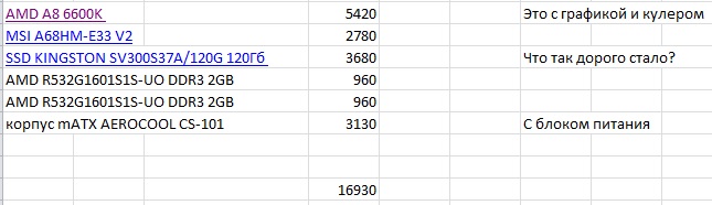1. Кулер надеюсь с учетом довольно горячего процессора и довольно узкого корпуса? 3. Эмм, нуу так доллар такой. Встречный вопрос - ССД нужен дешевый или хороший? просто выбор в принципе огромный, цены различаются сильно, но действительно стоящих - единицы. Хотя, даже дешевле и должен быть неплохой http://www.citilink.ru/catalog/computers_and_notebooks/hdd/ssd_in/394358/ Имхо заслуженный хит, правда с низкой скоростью записи - но зато ресурс http://www.citilink.ru/catalog/computers_and_notebooks/hdd/ssd_in/940118/ 4,5. Покупать сейчас планки по 2 Гб - не знаю... надо 4 - одну планку и берем. Тем более для мамки с всего двумя слотами.