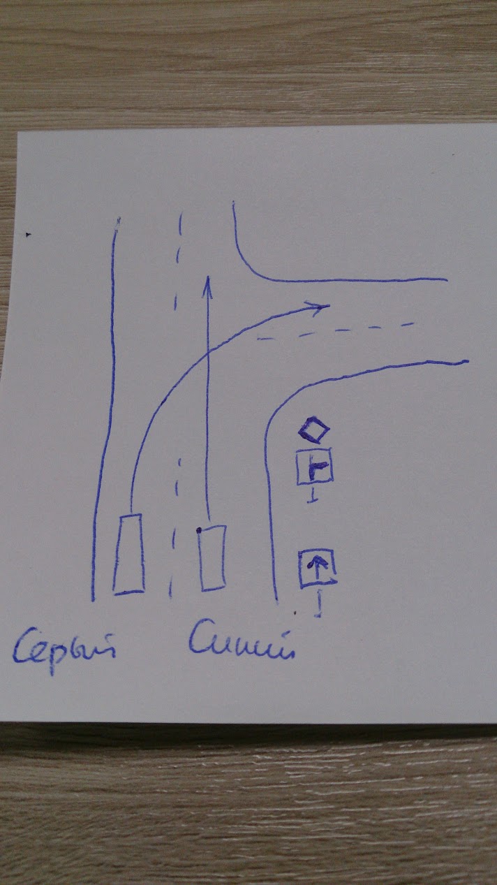 результат опроса в ОК выше, и тем на 100500 страниц с обсуждения в инете, вопрос попуылярный оказывается и многие впадают в ступор видя знак главной дороги спросил у коллег на работе из 4 человек сказали что синий виноват и с пеной у рта доказывают: "ты что знака главная дорога не видищь, белый же по главной едет", показываю картинку с Т образным перекрестком ручкой, говорят "что синий опять виноват, так знак главная дорога определяет главность движения и тот кто едет на не главную должен бояться и всех пропускать" - и это 4 из 4 так мне сказали независимо друг от друга