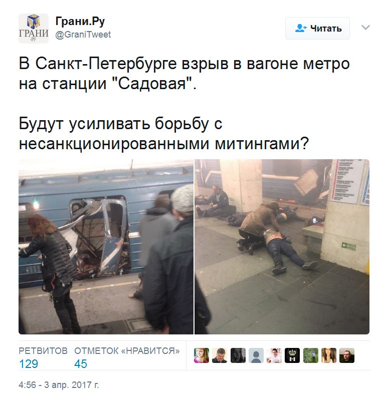 По их данным, инцидент случился на станции метро «Сенная площадь»​. В результате случившегося, по их словам, много пострадавших. Они также рассказали, что взрыв произошел в вагоне. Официальной информации по этому поводу пока нет.