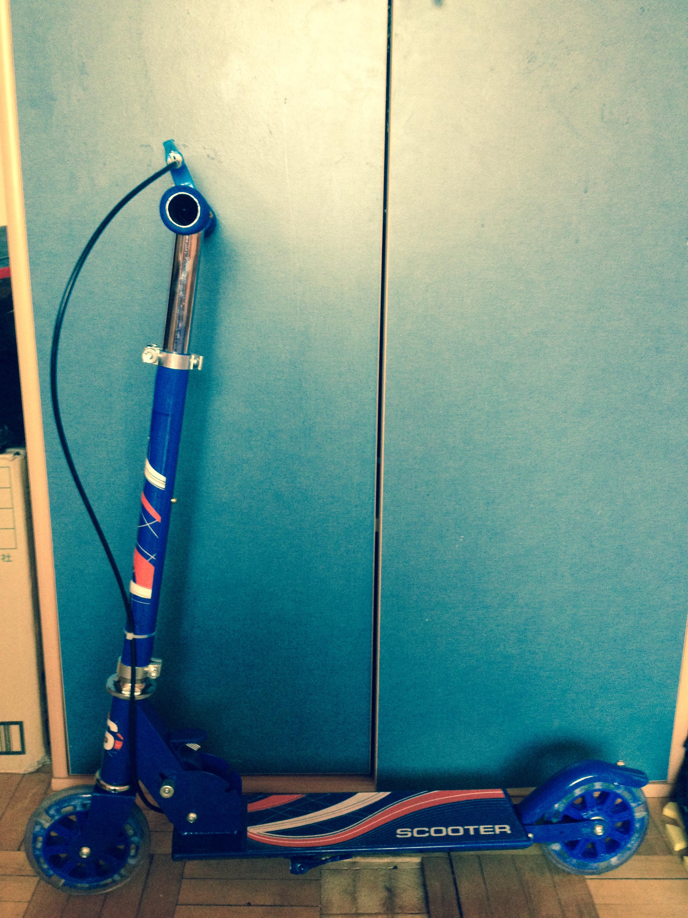 Удобный,маневренный, колеса светятся при езде, руль регулируется по высоте, два тормоза- задний и передний-ручной.