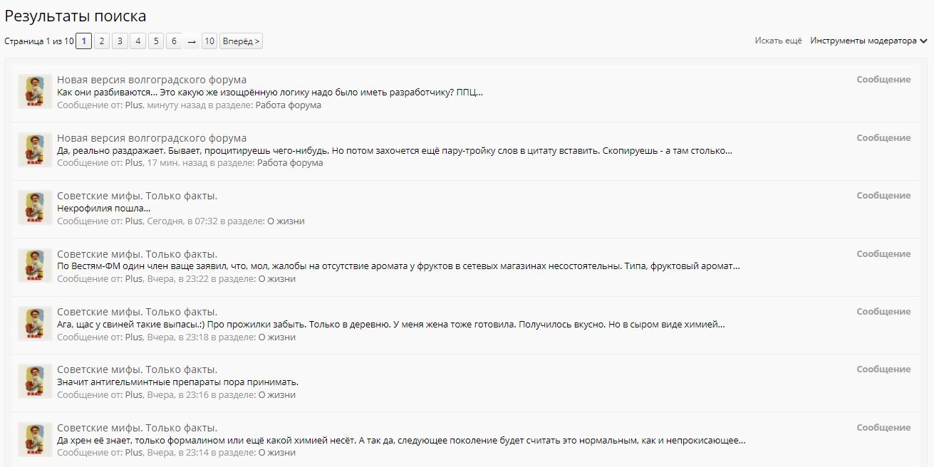@micron, Какой-то изврат. Посты выводятся, если склероз не изменяет, по 20 штук на странице. Всего 10 страниц показывается. Чтобы перейти на следующий десяток страниц, мне нужно перейти на последнюю странцу и жмакнуть показать больше постов (или как-то ещё кнопка называется). И так раз за разом. Если мне надо покапаться досконально на нескольких десятках страниц, то это ужас ужасный. В прошлой версии тоже был косяк: больше 10000 постов не отображалось. Но листать их было одно удовольствие. Здесь проблема в том, что листать можно только последовательно. Попытка нае...обмануть форум к успеху не приводит. К примеру, вот я роюсь, смотрю на адресную строку: https://www.forum-volgograd.ru/search/127655/ С каждым десятком страниц адрес прирастает на единицу. Ввожу: https://www.forum-volgograd.ru/search/127660/ - а вот хрен! Нет такой страницы. Но, если буду листать последовательно, то её есть.
