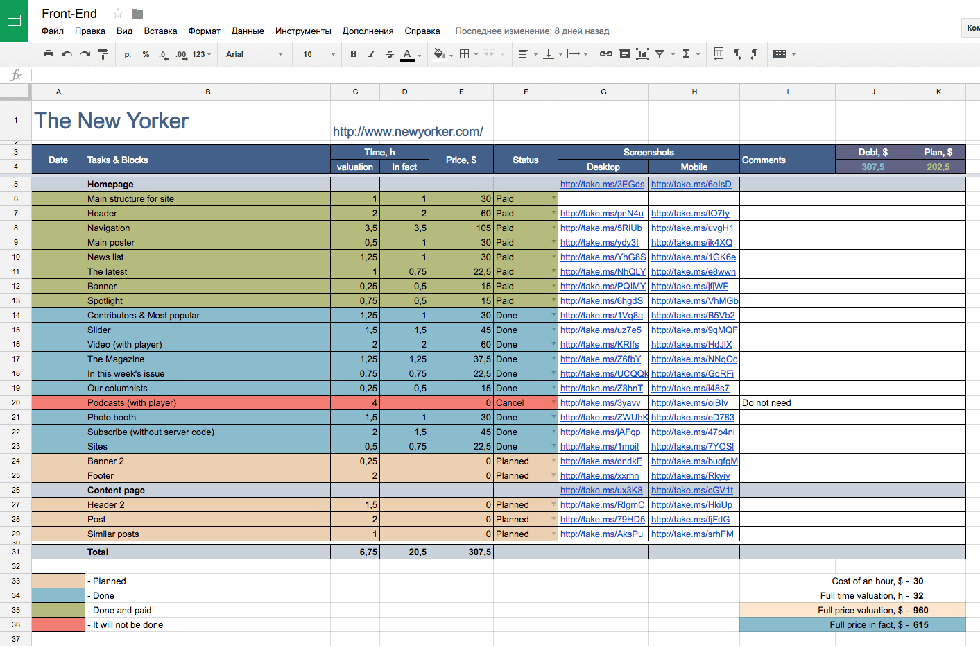 Да, хорошая штука для самоорганизации. Ни кто этим не пользуется на практике из присутствующих? Я в блокноте последнее время делаю пометки, сколько ушло времени, особенно на переговоры с заказчиком, как ни странно, т.к. они зачастую не хотя это время учитывать, как рабочее Видел на просторах инета скрины с xls таблиц, в примере ниже, одного дизайнера: Спрашиваю, т.к. давненько уже вынашиваю мысль написать очередной велодесктоп прогу для мака, что-бы организовывать задачи в пректы и чекать по ним время вручную для дальнейшего анализа и отчётов, возможно с интеграциями с внешними сервисами, трекерами задач...
