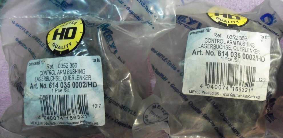 Собственно при разборке завалов в гараже найдены следующие запчасти, новые в истрепавшейся упаковке. Выбросить рука не поднимается. Куплены давно, в бытность когда Китай ещё не штамповал. 1) 8A0412323D Опора переднего амортизатора Применение Audi 80/90 [B2] >1986, Audi 80/90 [B3] 1986-1991, Audi 80/90 [B4] 1991-1994, VW Passat [B2] >1988 2) 108757 AUDI A4 (8D2, B5), A4 (8E2, B6), A4 (8EC, B7), A4 Avant (8D5, B5), A4 Avant (8E5, B6), A4 Avant (8ED, B7), A6 (4B2, C5), A6 Avant (4B5, C5) SKODA SUPERB (3U4) VW PASSAT (3B2), PASSAT (3B3), PASSAT Variant (3B5), PASSAT Variant (3B6) TOPRAN 108 757 идентичен следующим оригинальным запчастям: AUDI 01V 321 371 PORSCHE 01V 321 371 SEAT 01V 321 371 SKODA 01V 321 371 VW 01V 321 371 3)153939 Сайлентблок подрамника (задний) Примечание VAG Audi 80 (B2/B3) / VAG Passat (B2) Номера производителя (OE) VW 811199419B, 811199419C, 893199419 4) 6140350002HD Сайлентблок рычага Opel Astra F/G all 91>/Vectra 5) 94.644.424 САЙЛЕНТ-БЛОК РЫЧАГА General Motors CHEVROLET LACETTI//REZZO ПЕРЕДНИЙ Керосин в любой упаковки приветствуется вместо шоколадки.