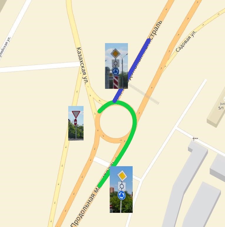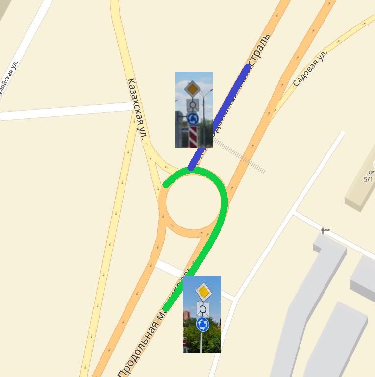 это если просто перекрёсток. а вот круговой перекрёсток не совсем простой. и именно для него ввели 13,11(1) так вот в том то и дело, что введённый п.13,11(1) в ПДД портит организацию знаков на данном перекрёстке. толи мы про разные перекрётски говорим, толи про разные ситуации. не понимаю... схематично так (на яндекс картах тёмным как раз так же как и по знакам главная дорога). зелёный имеет желание развернуться на круге, синий въехать на него. подъехжая ОБА ТС видят знаки ОДИНАКОВЫЕ. оба на главной, оба видят, что круг является главным направлением. и оба видят 4,3. только зелёный уже НА круге, а синий только собирается на него въехать, и ему придётся выполнить 13,11(1) и уступить зелёному, хоть и является помехой справа.