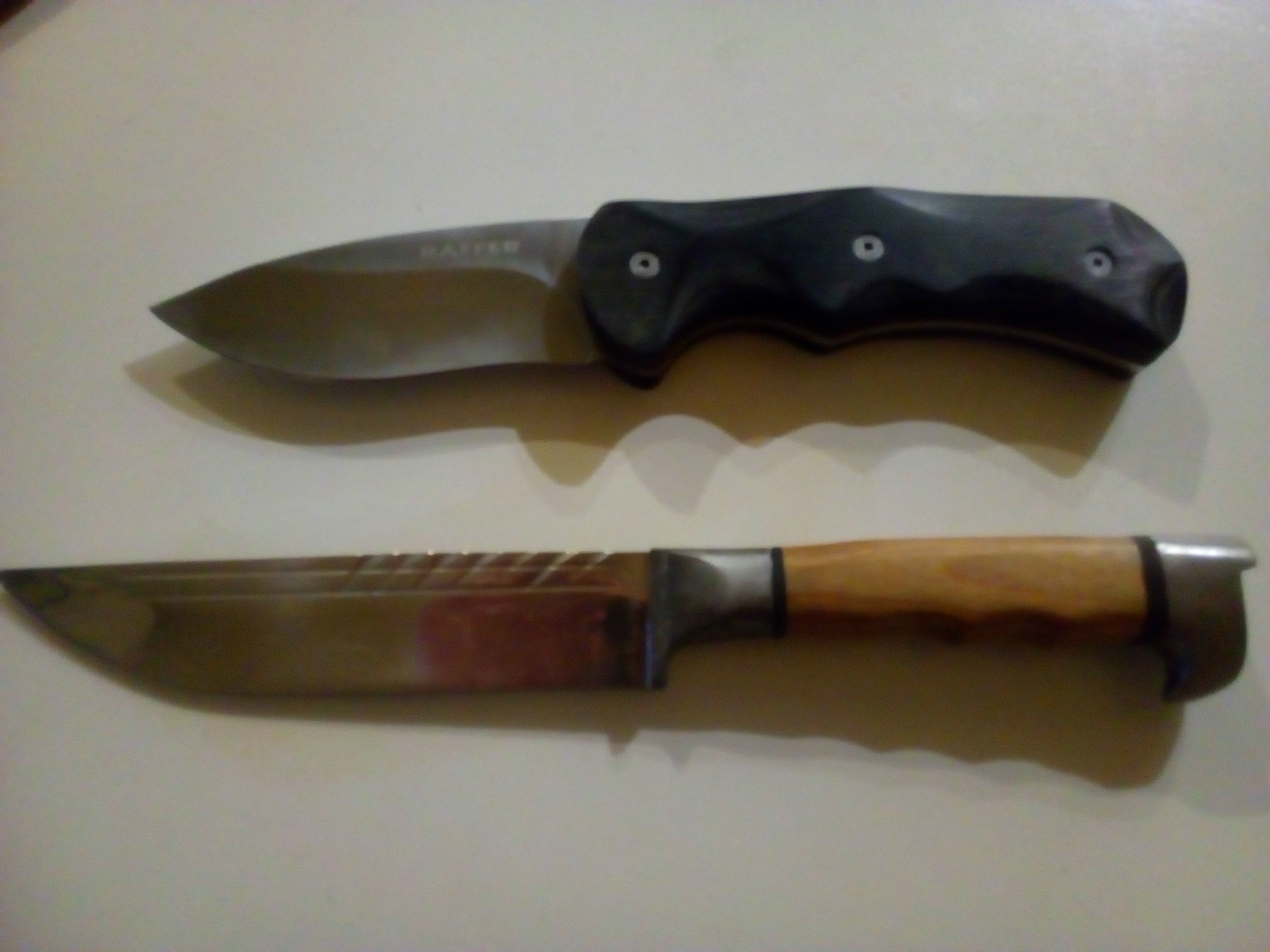 Продам: 1. Топорик для рубки мяса. Времен СССР, дефект - трещина в деревянной рукояти, рукоть под замену. 500 р. 2. Нож Витязь, железо - 65х13, дефект - лопина на лезвии, на фото видно, требует переточки. 300 р. 3. Нож Раффер, без дефектов., куплен на сдачу в хищнике. 300 р. 4. Нож Витязь, "кинжал", 65х13, вот такой - Кинжал Витязь B110-33 купить в магазине ножей КЛЫК.РУ. Ножи Витязь (Россия) 500р. 5. Нож Пчак, узбекский, ШХ-15, рукоять оргстекло, ручная работа. 500р. Отдам только все вместе. Все - не ХО. +500 рублей и подберу ко всему кроме топора скромные ножны.