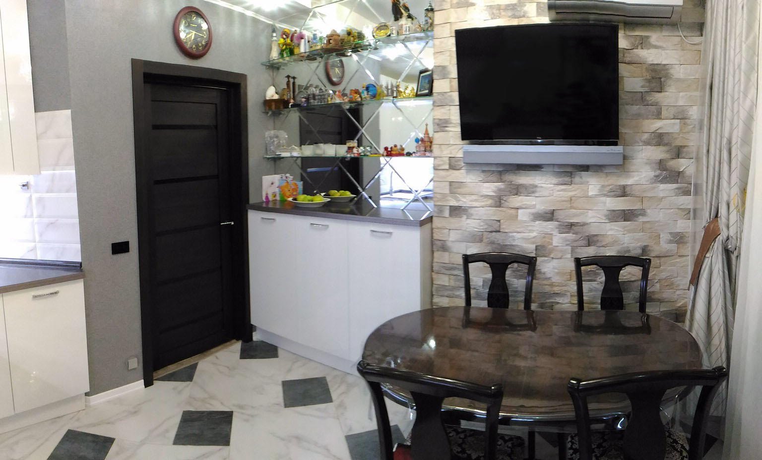 Я хотела темный ремонт в квартире. Но, она маленькая и чтобы казалось места поболее и не была темной конурой, сделали светлый ремонт. На тот момент не совсем осознавала я маркости темных поверхностей, потому фартук и столешница чёрные)) Хорошо что остальное в квартире белое сделали