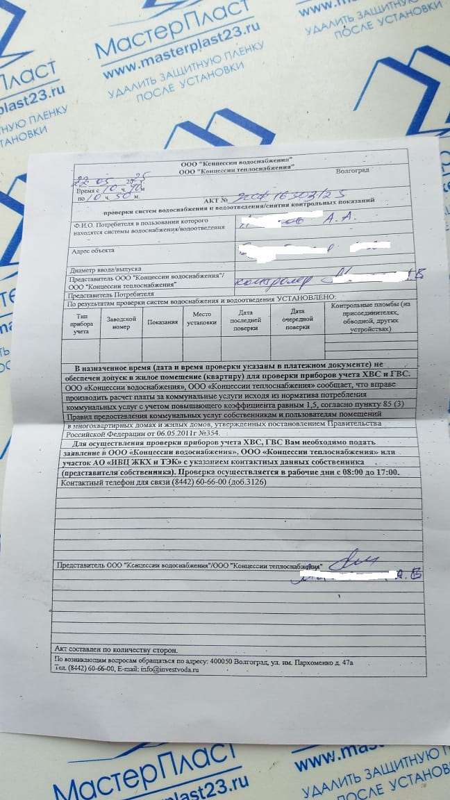 вот смотрите, какая хурма, ребята. пришёл вот такой акт по почте. якобы 22 мая в 10:40 шаркал и кащлял под дверью йуный контролёр концессий, но меня не было дома (что справедливо в 10 то 40 утра) предварительных звонков и уведомлений никаких не было. я вот вообще думаю первое - щьто это такое, кроме как попытка отъёма денег (5 человек прописано, по нормам будет условно 2900 вместо 300р по счётчику) второе - а был ли мальчик третье - щьто теперь делоть. щщётчики все поверенные.
