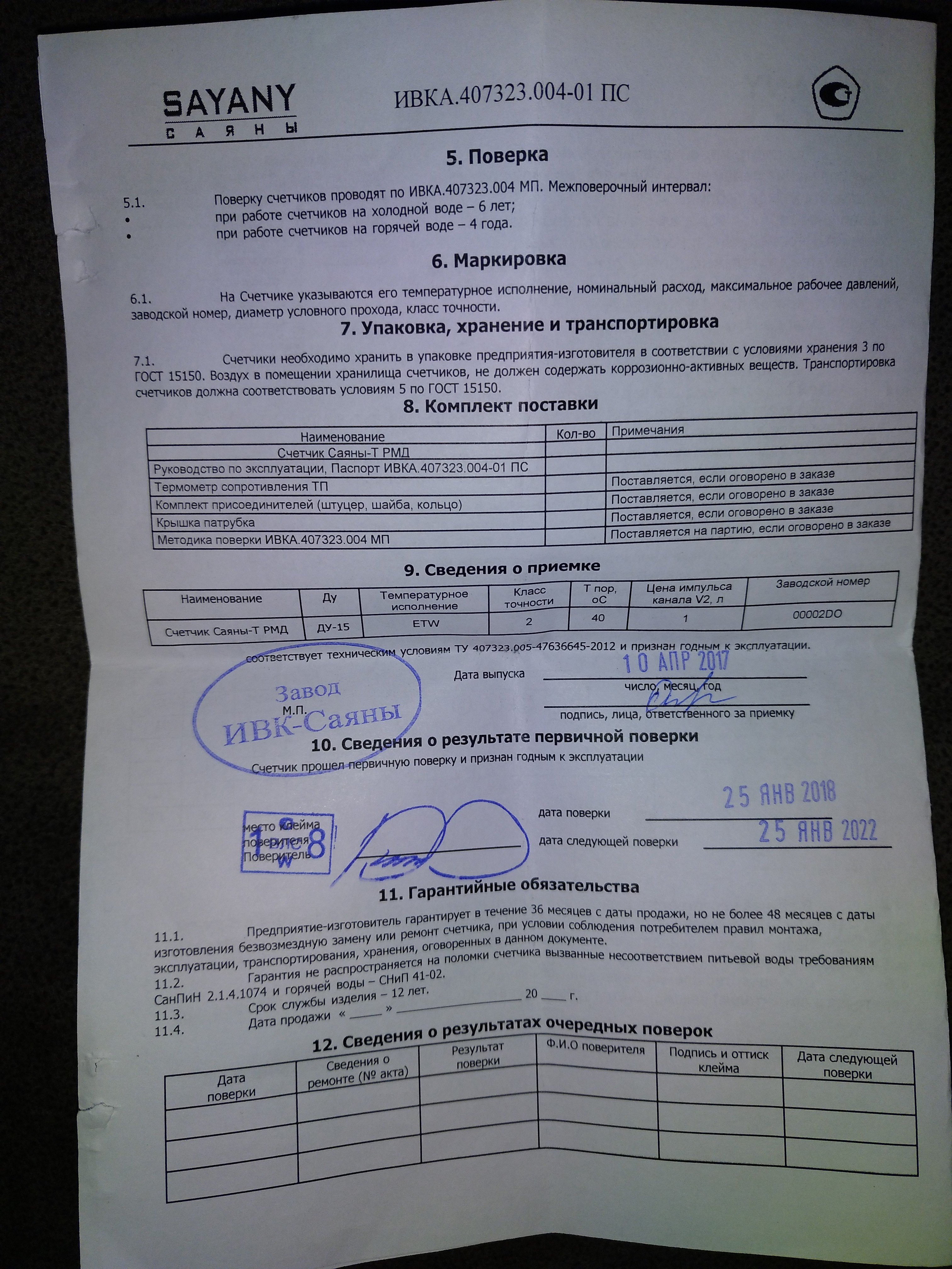 Совершенно новый, (дата поверки 25 января 2018 года, срок поверки 4 года), есть паспорт как на счётчик, так и на термодатчик. В комплекте есть установочный комплект, для установки счётчика.