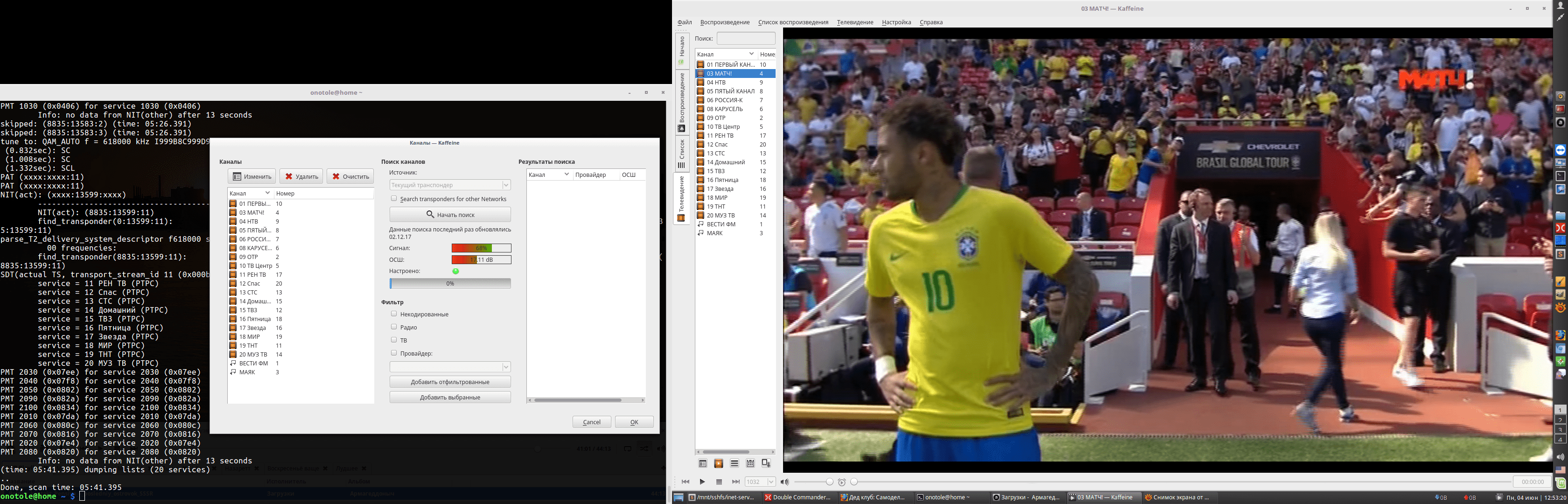 Настала пятница, работа отпустила, можно поговорить о ненужном Чуток инфы добыл — одноклассник и однокашник, живущий на моей улице в 200 метрах восточнее, говорит, что нонейм-приставка на гвоздик у него ничего не поймала. В «гвоздиках» он разбирается, такой же авиационный радиоинженер, как и я. А в аэропорту, грит, ловит на ура. Технической информации, понятно, с его чорной коробочки не добудешь. Антенна прям на компе (как на фото в первом посте) разве что чуть хуже, чем в окне. Вчера вечером немного разобрался в нюансах, продвинулся, тасазать, в познании (подробности ниже). Устойчивые результаты: На южном окне, которое: первый, он же единственный, этаж, прямая видимость на Красноармейск, Мамайка и Жилуха загорожена с севера бугром (СХИ) плюс девятиэтажки на самом верху. ...уровень сигнала практически такой же, как ежели антенну прилепить на системник. И там, и там, 35-39%, что бы эти про́центы не означали. Вертикальное положение штыря немного лучше, чем горизонтальное, но на 37 канале резко падает SNR (отношение сигнал/шум). Возможно, лезет наводка от W-Fi передатчика роутера, надо бы без него попробовать. Это сведения или догадки? Я их антенны не видел, ничего сказать не могу. Я вообще не знаю, как работает на цифре вещание нескольких вышек на одном частотном канале. Что-то хитрое, моих знаний не хватает. Практика показала что полуволновый штырь (24 см с ножкой) работает заметно лучше, чем четвертьволновый. Если его укоротить до четвертьволнового, уровень падает с 45% до 35% примерно, а SNR где-то от 10-12 дБ до 5-8. Вообще говоря, какбэ ловиться должно. Но. Вот тут я потерпел анфиску, после, казалось бы, уже поймал за хвост. Забегая вперед: Завел под виртуалбоксом бесплатный образ от Микрософта, который для вебмастеров. Поставил дрова от производителя, с той же страницы кодеки и рекомендованный производителем DVB плеер. Пробросил USB-устройства на виртуалку. Все встало на ура, устройство опозналось, плеер при сканировании уверенно ловил сигнал транспондеров, но разобраться в нем не сумел. Итого ноль найденных каналов. Тут какая закавыка. Вчера утром потыкался, и сегодня с утра немного. Выяснилось: не хлебом единым — дрова дровами, а еще фирмварь нужон. Позавчера с устатку затупил (устройство ж опозналось!), а так — в линухе в большинстве случаев можно найти информацию, что не так, и куда копать. Сообразил, наконец, посмотреть классику — сообщения dmesg, а там же ж англицким по черному написано, чево и скока: ERROR! Требуется фирмварь! И, поди ж ты, написано, какая именно: «dvb-demod-mn88473-01.fw». Фирмварь эта выгугливается в полсекунды, скачивается примерно столько же (крохотная). Это, типа, микрокод для дивайса. После чего — якорный бабай! — утилита сканирования опознала транспордеры (суть события — заработала микросхема Panasonic MN88473, которая аппаратный декодер этого самого DVB-T2). А dmesg вместо краткого ругательства высыпал кучу сообщений о подключении многочисленных потрохов этого свистка: Спойлер Код: [ +0,114760] usb 1-7.4: dvb_usb_v2: found a 'Astrometa DVB-T2' in warm state [ +0,073772] usb 1-7.4: dvb_usb_v2: will pass the complete MPEG2 transport stream to the software demuxer [ +0,000014] dvbdev: DVB: registering new adapter (Astrometa DVB-T2) [ +0,007926] i2c i2c-8: Added multiplexed i2c bus 9 [ +0,000003] rtl2832 8-0010: Realtek RTL2832 successfully attached [ +0,006423] mn88473 8-0018: Panasonic MN88473 successfully identified [ +0,000029] usb 1-7.4: DVB: registering adapter 0 frontend 0 (Realtek RTL2832 (DVB-T))... [ +0,000063] usb 1-7.4: DVB: registering adapter 0 frontend 1 (Panasonic MN88473)... [ +0,000065] r820t 9-003a: creating new instance [ +0,006959] r820t 9-003a: Rafael Micro r820t succ
