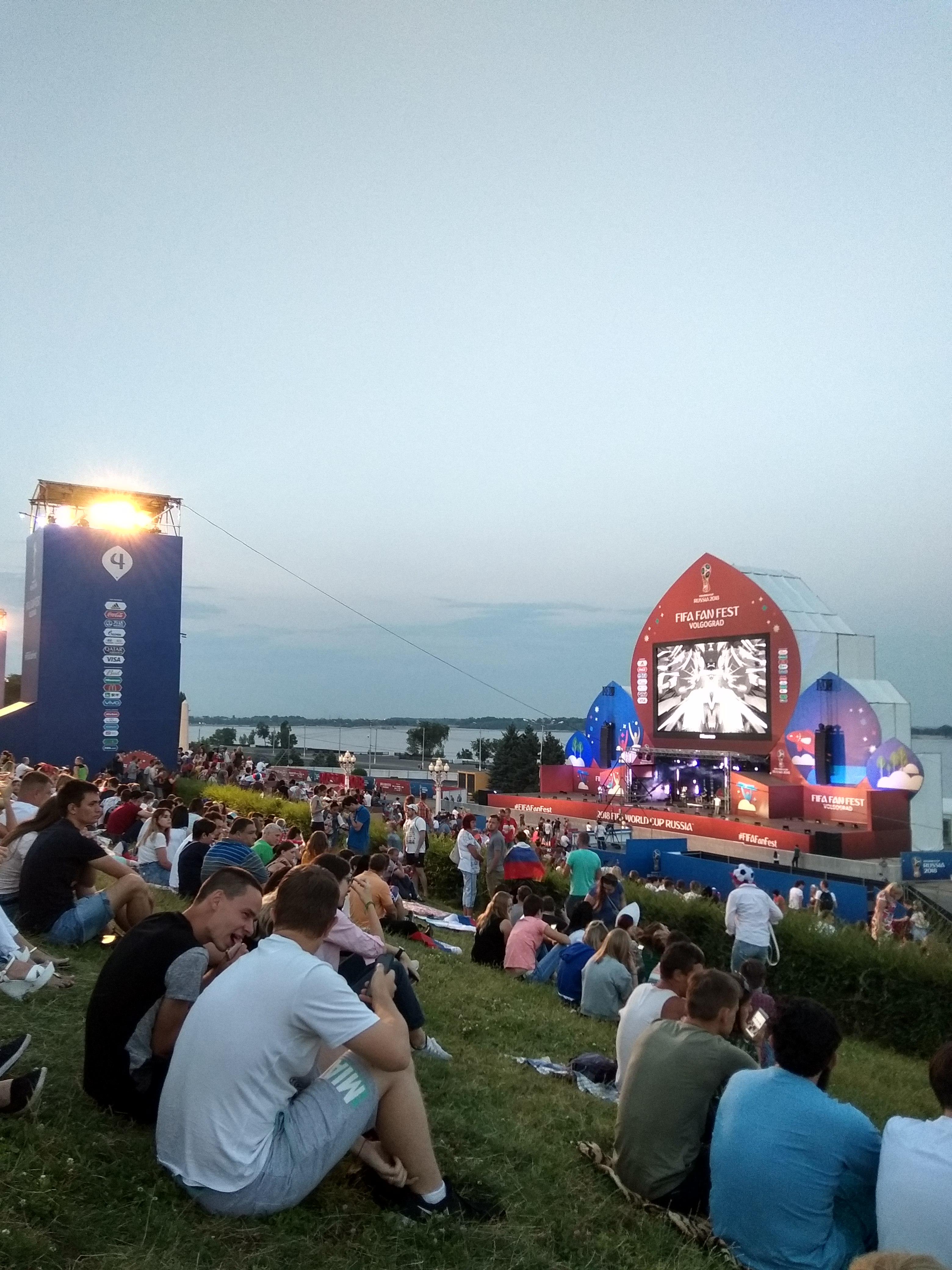 Рассказываю: народу очень много. Так много, что если ноги согнёшь, место займут) Делали волну. Сейчас вся фан-зона кричит за наших игроков, за кого громче. Классно здесь.