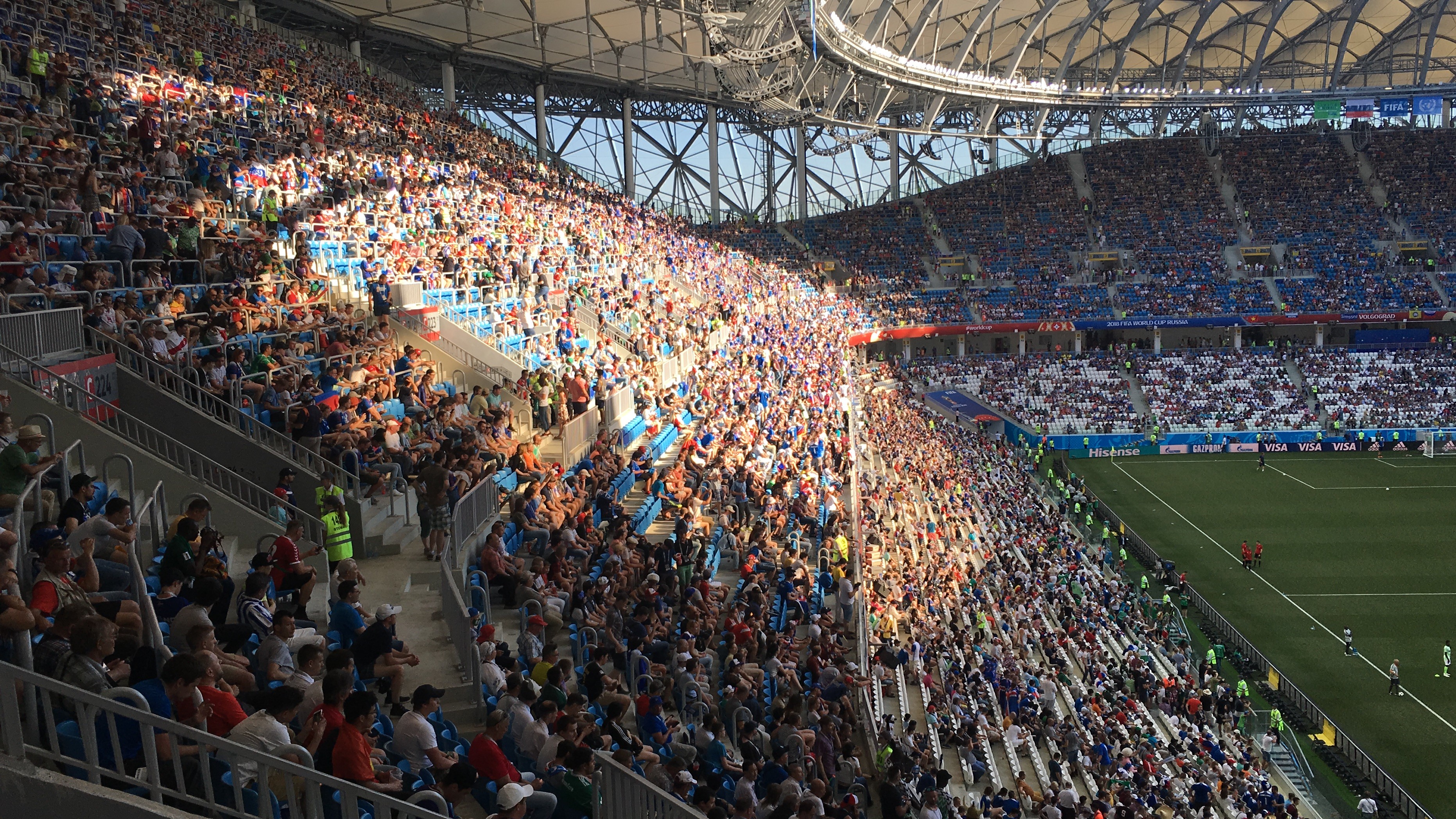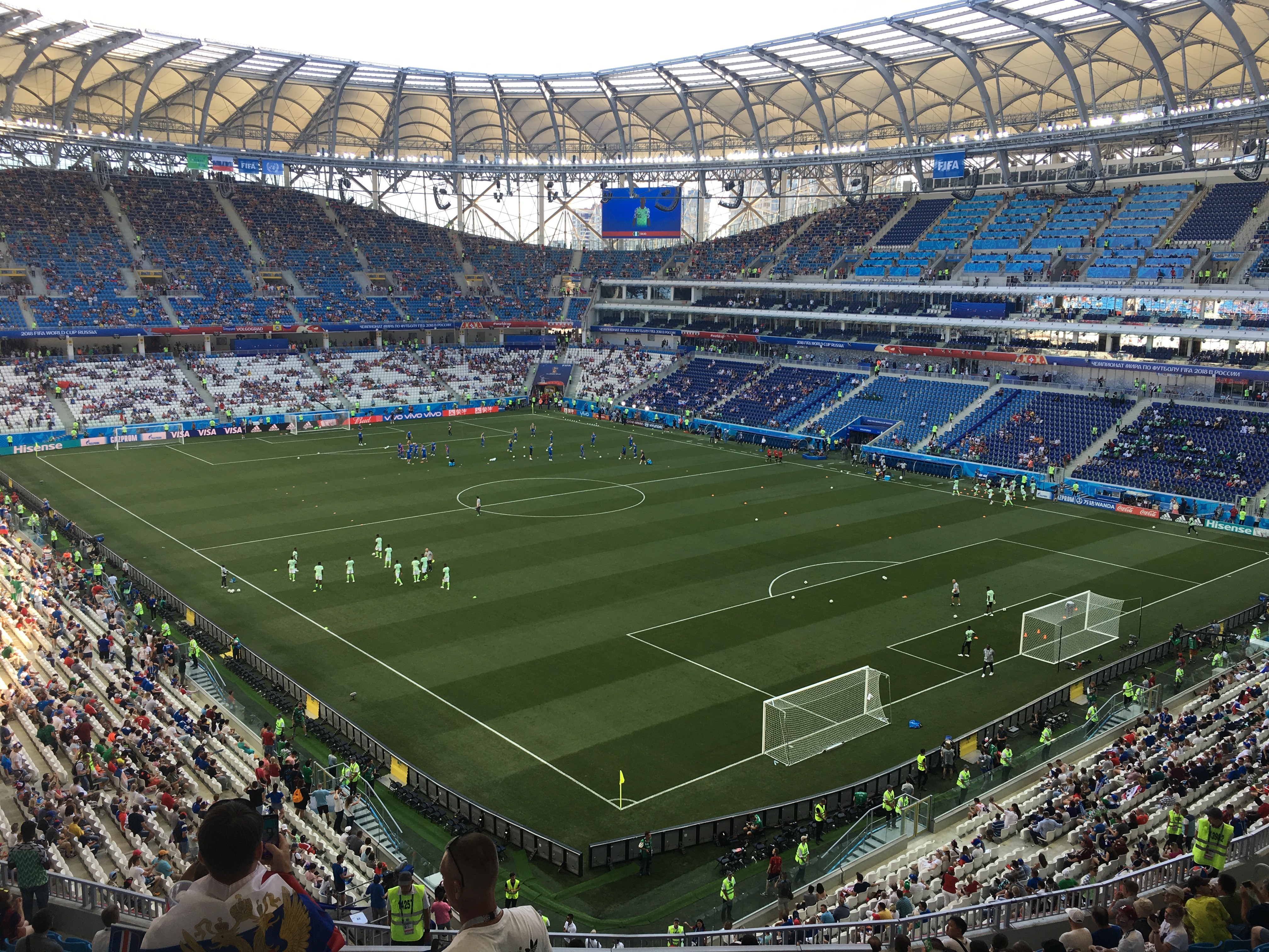 Привет с д110, третий ряд за воротами. Сейчас буду за нигерийским вратарем, надеюсь, увижу мяч в сетке!!! обзор, конечно, не так хорош отсюда, зато когда идет рядрм борьба, все пря возле тебя, очуменно