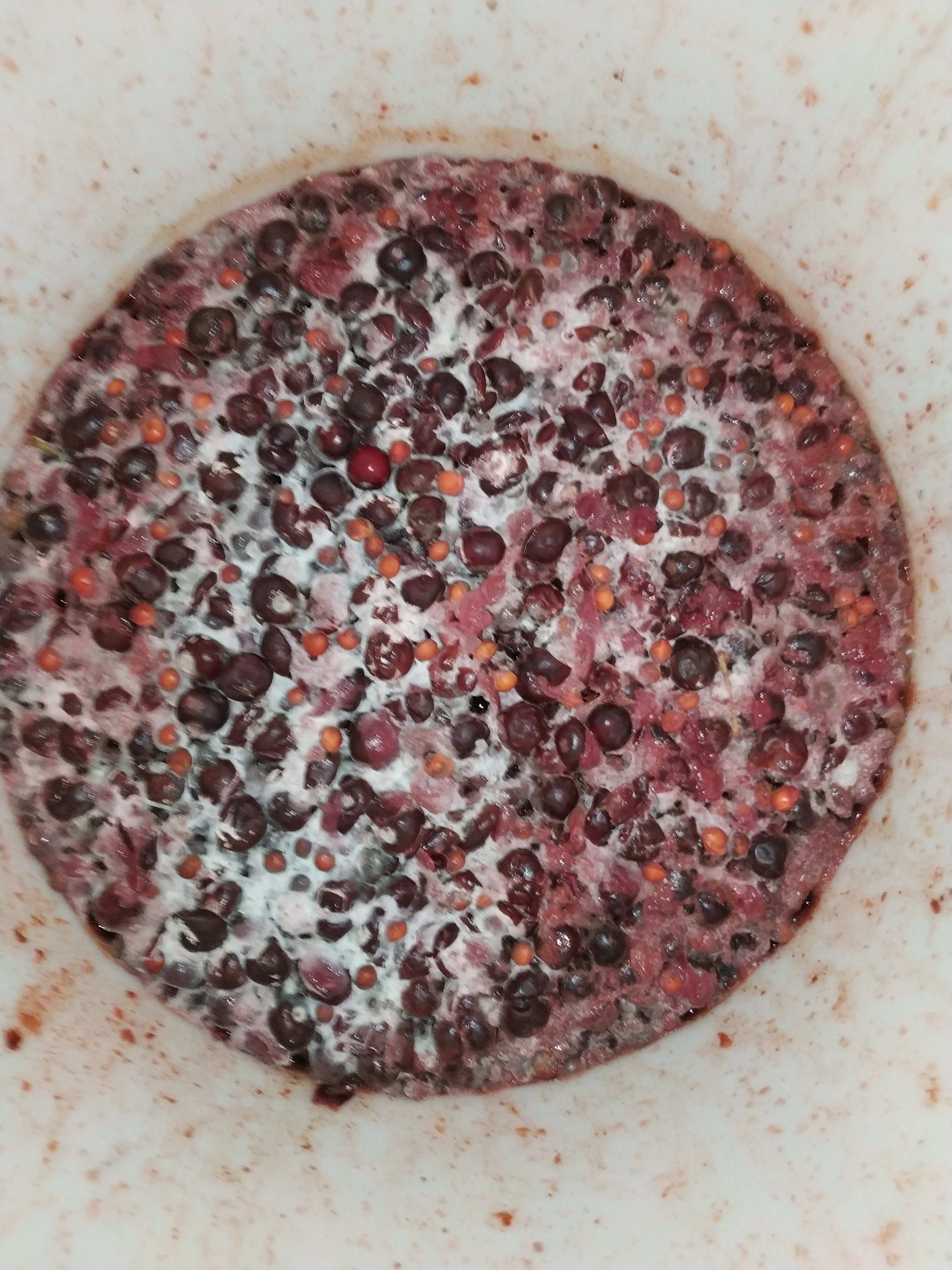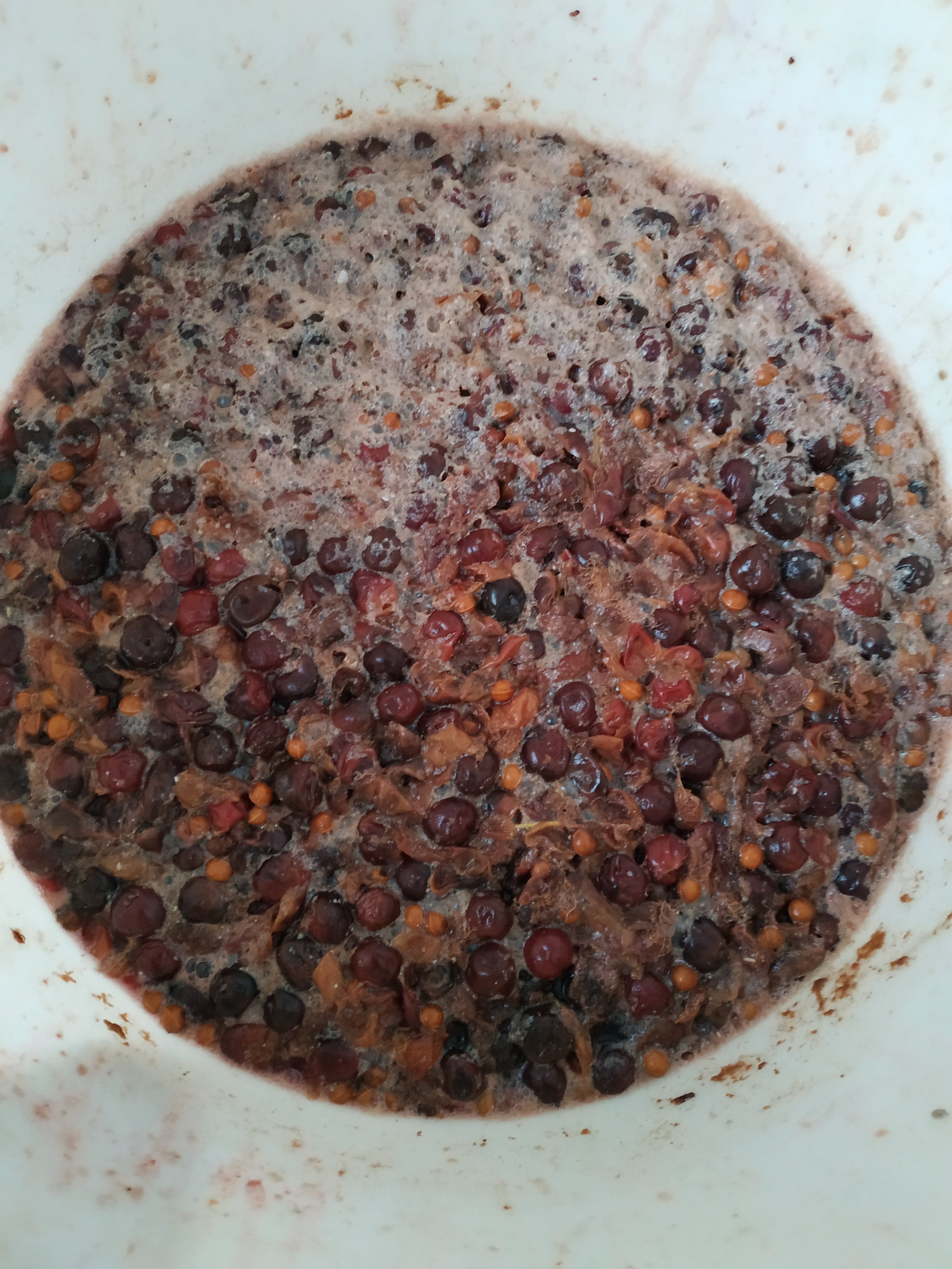 я конечно винодел ещё тот, но в собранную вишню (черная морель) воду вообще не добавляла. как и сахар (так как она изначально крупная сладкая и сочная) Бродило неделю. вчера отжала без фанатизма. получилось литра 4 чистого сока. в процеженный сок добавила немного сахара, косточек и отставила в сторону. Остатки жмыха положила обратно и залила 2-я литрами воды и оставила ещё постоять-настояться (типа зачем простую воду добавлять, если можно такую воду))). с утра бродит. думаю отжать к вечеру, смешать, разлить и под гидрозатвор.