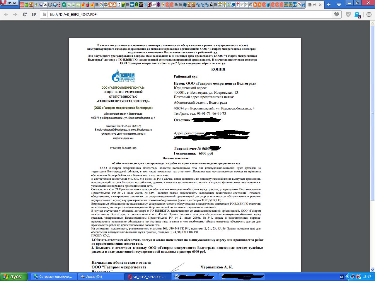 пришло такое уведомление. договор (НЕ с горгазом) есть. на запрос предоставить копию по электронке в прошлом году ВЫПОЛНИЛ, хотя и написал в примечаниях, что НЕ обязан. т.к. в законодательстве я не нашёл такого ОБЯЗАТЕЛЬСТВА как предоставление инфы о заключённом договоре. так что пусть подают. 6 тыр со своей прибыли потом спишут... а вот тут то и кроется засада. сначала ЗАСТАВИЛИ поставить счётчики. а потом офигели от того на сколько снизились поступления за оплату газа. продавили закон на ТО газ.оборуд-ия, что б хоть как то компенсировать потери. разделили компании поставщиков и ТО газа\оборудования... @Участник_1, ты как всегда красава дата есть. слева от слов "лицевой счёт", внизу шапки\реквизитов Газпрома.
