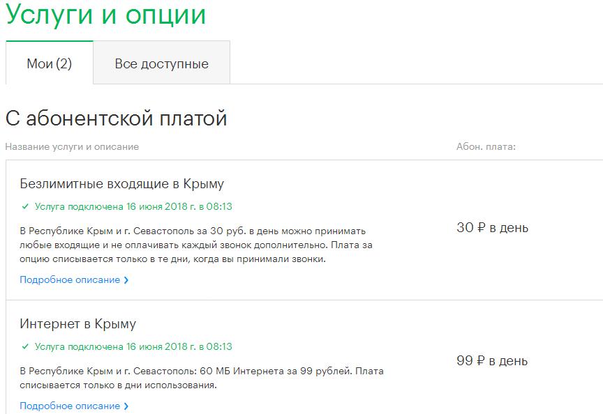 Аналогично Крым и АнтиАОН на разных номерах по-разному Спойлер Безлимитные входящие в Крыму Услуга подключена 7 сентября 2018 г. в 10:48 В Республике Крым и г. Севастополь за 30 руб. в день можно принимать любые входящие и не оплачивать каждый звонок дополнительно. Плата за опцию списывается только в те дни, когда вы принимали звонки.Подробное описание 0 ₽ Спойлер Безлимитные входящие в Крыму Услуга подключена 24 июня 2018 г. в 09:19 В Республике Крым и г. Севастополь за 30 руб. в день можно принимать любые входящие и не оплачивать каждый звонок дополнительно. Плата за опцию списывается только в те дни, когда вы принимали звонки.Подробное описание 0 ₽ Интернет в Крыму Услуга подключена 24 июня 2018 г. в 09:19 В Республике Крым и г. Севастополь: 60 МБ Интернета за 99 рублей. Плата списывается только в дни использования.Подробное описание 0 ₽ Спойлер Разовый АнтиАОН Услуга подключена 16 июня 2018 г. в 07:21 Скрывает ваш номер, когда это необходимо, даже если у человека, которому вы звоните, включен «Определитель номера».Подробное описание 0 ₽ в месяц Автопродление интернет-опций Услуга подключена 6 сентября 2018 г. в 22:18 Дополнительный трафик для интернет-опций.Подробное описание 0 ₽ в месяц С абонентской платой Название услуги и описание Абон. плата: Безлимитные входящие в Крыму Услуга подключена 16 июня 2018 г. в 07:21 В Республике Крым и г. Севастополь за 30 руб. в день можно принимать любые входящие и не оплачивать каждый звонок дополнительно. Плата за опцию списывается только в те дни, когда вы принимали звонки.Подробное описание 30 ₽ в день