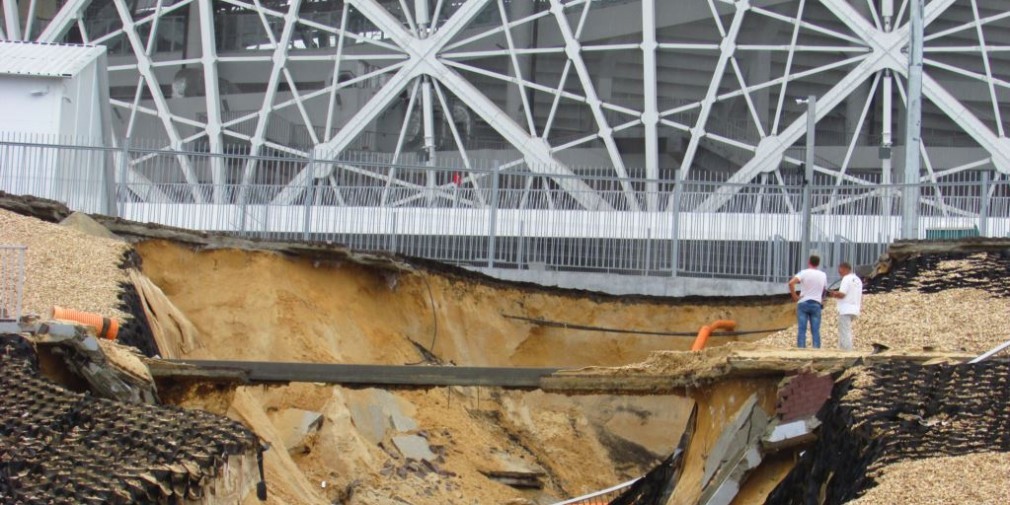 Медитируете? Причем тут вообще стадион, если размыло обсыпь склона, несущую в основном декоративную функцию? Берег укреплен там вот такими штуками. Хрен их смоет. А сверху уже навалил песка, щебня и бетона. А вот фото со стройки Ростов-Арены. Они там несколько тысяч свай вбили. Да, это Ростов, но сильно сомневаюсь, что в Волгограде забыли сделать тоже самое.