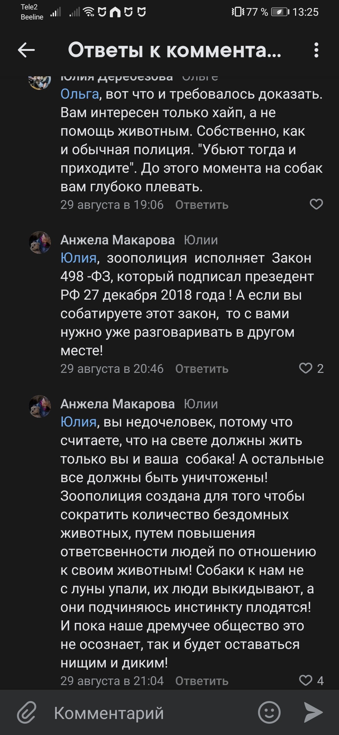Меня ещё радует "подчиняюсь инстинкту". Видимо, подчиняясь она и катает этот бред, создает "зоополицию" и прочее. И по 10к за труп собаки собирает "на экспертизу ". Вообще идеальная схема. Стрелять и травить их будут до тех пор пока они будут на улице. А будут на улице они до тех пор, пока этот ФЗ не отменят. Деньги можно бесконечно собирать. И даже собак трогать не надо.
