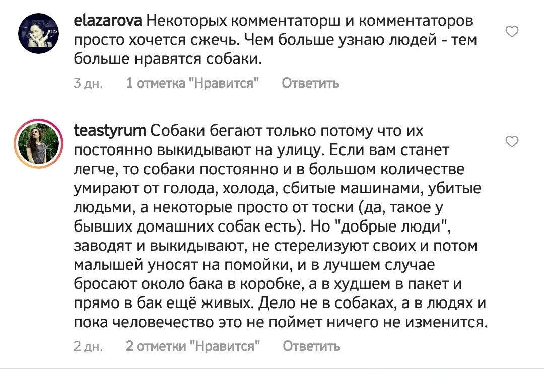 И что в комментариях? А в комментариях опять набежала куча отмороженных сук (их даже людьми назвать нельзя) и исступлённо воют шаблонные мантры: виноваты люди, выкинувшие собак (хотя там уже, наверное, двадцатое поколение собак, родившихся и выросших изначально на улице в стае); собаки просто так не нападают; нужно быть добрее, милосерднее, у людей нет ни души, ни сердца, вот покормили бы собак, никто бы не напал; люди куда более жестокие, чем собаки, и пр.