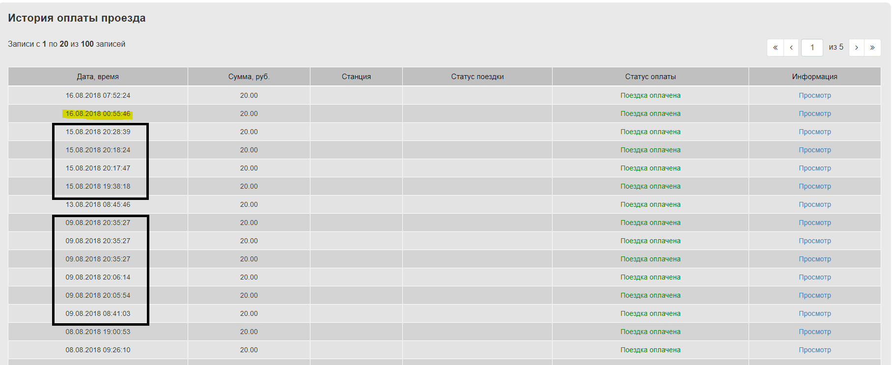 Да время пофиг. оно вообще мало на что влияет, может быть множество технических причин, почему терминал так проводит операции. Тут два вопроса (интересны на них ответы) 1) Сколько операций списания в банке (так как на картинках это же некоторый отчет из билетной фирмы). Главное же сколько в итоге в банк передали списаний. 2) Сколько реально было поездок (совпадает ли реальное количество поездок, с реальным списанием в банке). Так то может просто отчет на сайте билетном глючит. в на билетом сайте 5-ть строчек, а в банке всего одно списание.