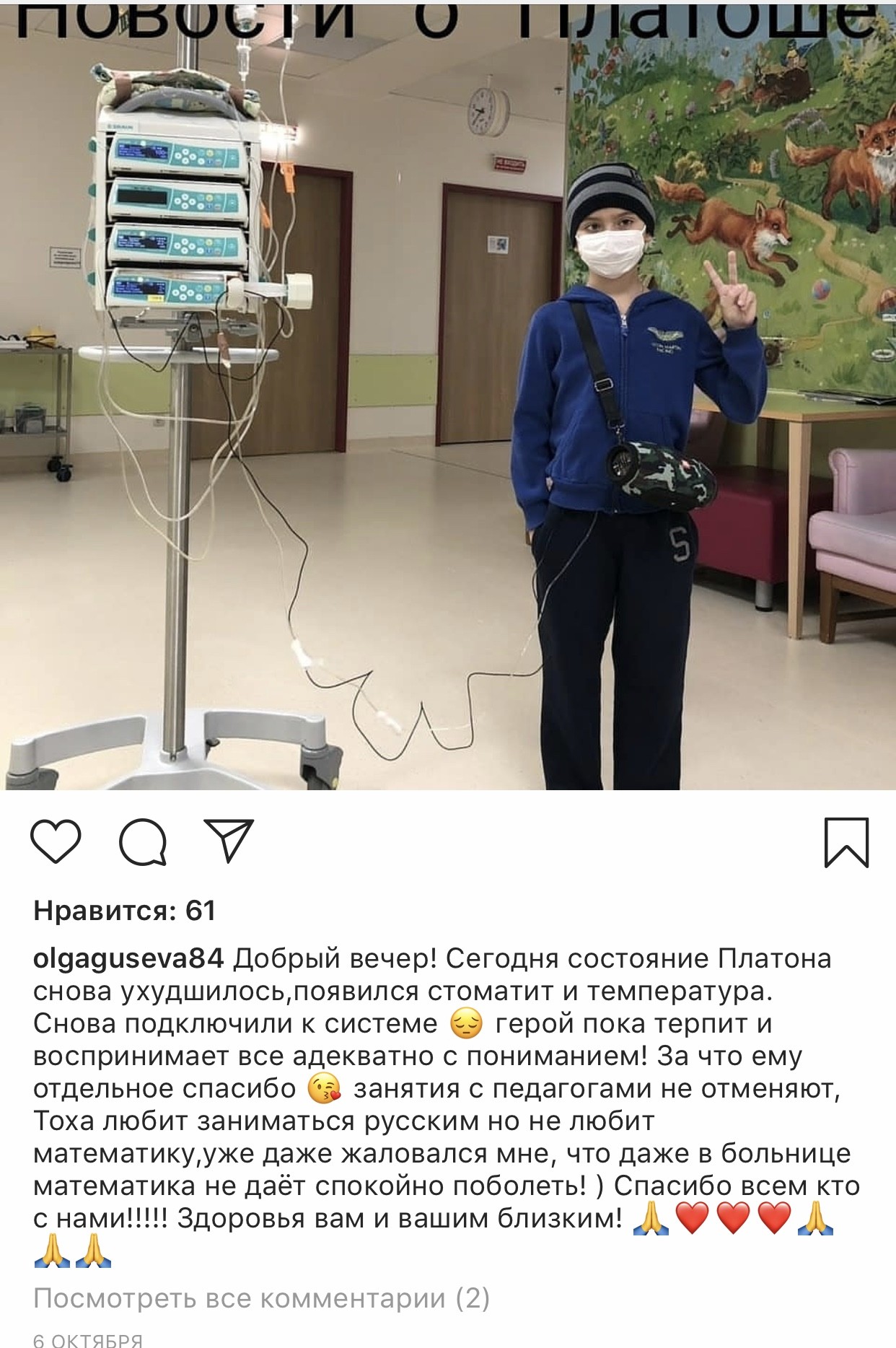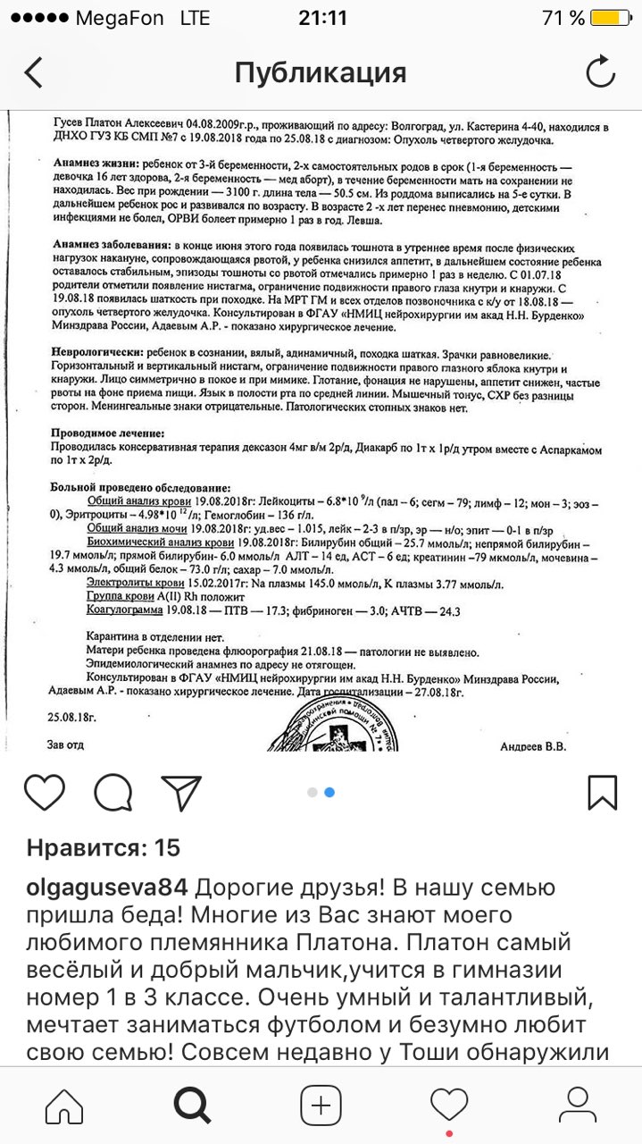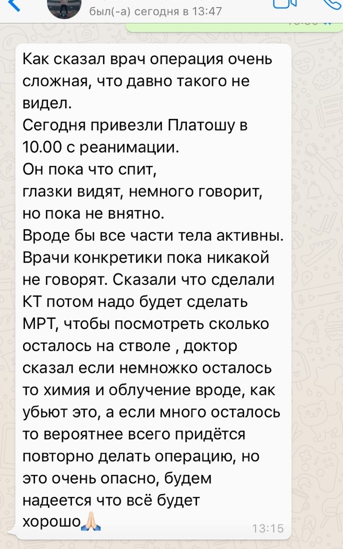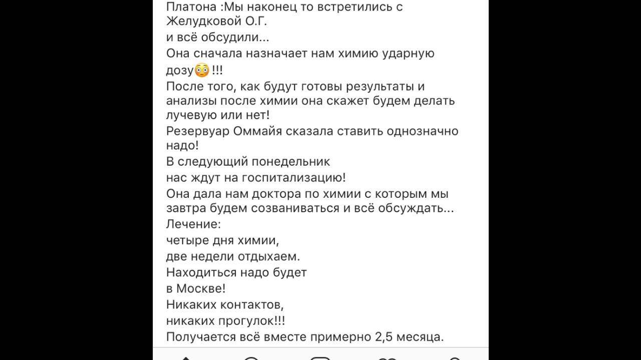 крайнее сообщение Завтра у Платоши будет операция и под общим наркозом ему будут устанавливать в голове резервуар Оммайя. Он ставится на всю жизнь Врач назначила сначала нам химию, ударную дозу !!! После того как её пройдут, будет трёх недельный перерыв за который будет сделано повторное МРТ и все анализы. Если после первого курса результаты и анализы будут хорошими, то после химии будут проводить лучевую терапию ! Если после первого курса, химия не убьёт остатки опухоли и метастазы, то будет повторный такой же курс, а после чего облучение. В следующий понедельник нас ждут на госпитализацию! Лечение будет проходить:«ХИМИЯ» НПЦ ВОЙНО-ЯСЕНЕЦКОГО «ЛУЧЕВАЯ» ФГБУ "РНЦРР" Минздрава России КУРС ЛЕЧЕНИЯ: 4 дня химии,14 дней отдыхаем (и так 4 раза), затем 21 день перерыв. После химии и отдыха будет облучение 40-60 дней, которое мы будем находится всегда в больнице. Находиться нам надо будет всё это время в Москве и соответственно пока будет идти химия будем снимать квартиру рядом с клиникой. Примерная стоимость квартиры 35-50т в месяц без коммунальных услуг, предоплата за первый и последний месяц сразу ! Для нас исключены на всё время лечения любые контакты, никаких прогулок вообще. Получается примерно при лучшем раскладе и хороших анализах и МРТ в Москве мы будем жить до конца декабря.
