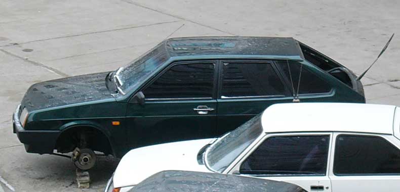 Кстати, мне рассказали, как снимают колеса. Если вы думаете, что ставят кирпичи, то ни фига подобного, это уже не модно. после откручивания болтов машину просто толкают! Иногда колеса не соскакивают, а остаются под крыльями, выворачивая их Неудивительно, что воров, если поймают, бьют смертным боем. Представьте свою машину в таком виде, это же ужас! FIRS Разные районы - разные цены. На Павелецком и в Центральном округа столько стоянка и стоит. Я вообще за 20 р. нашел. romych112 Спасибо В этой ситуации оказались не только плюсы, но и минусы - не выспался, в результате вчего притер вчера служебную машину главбуха - царапины на бампере. Сегодня буду общаться с водилой - вчера главбух спешила Денег ему что ли дать на полировку