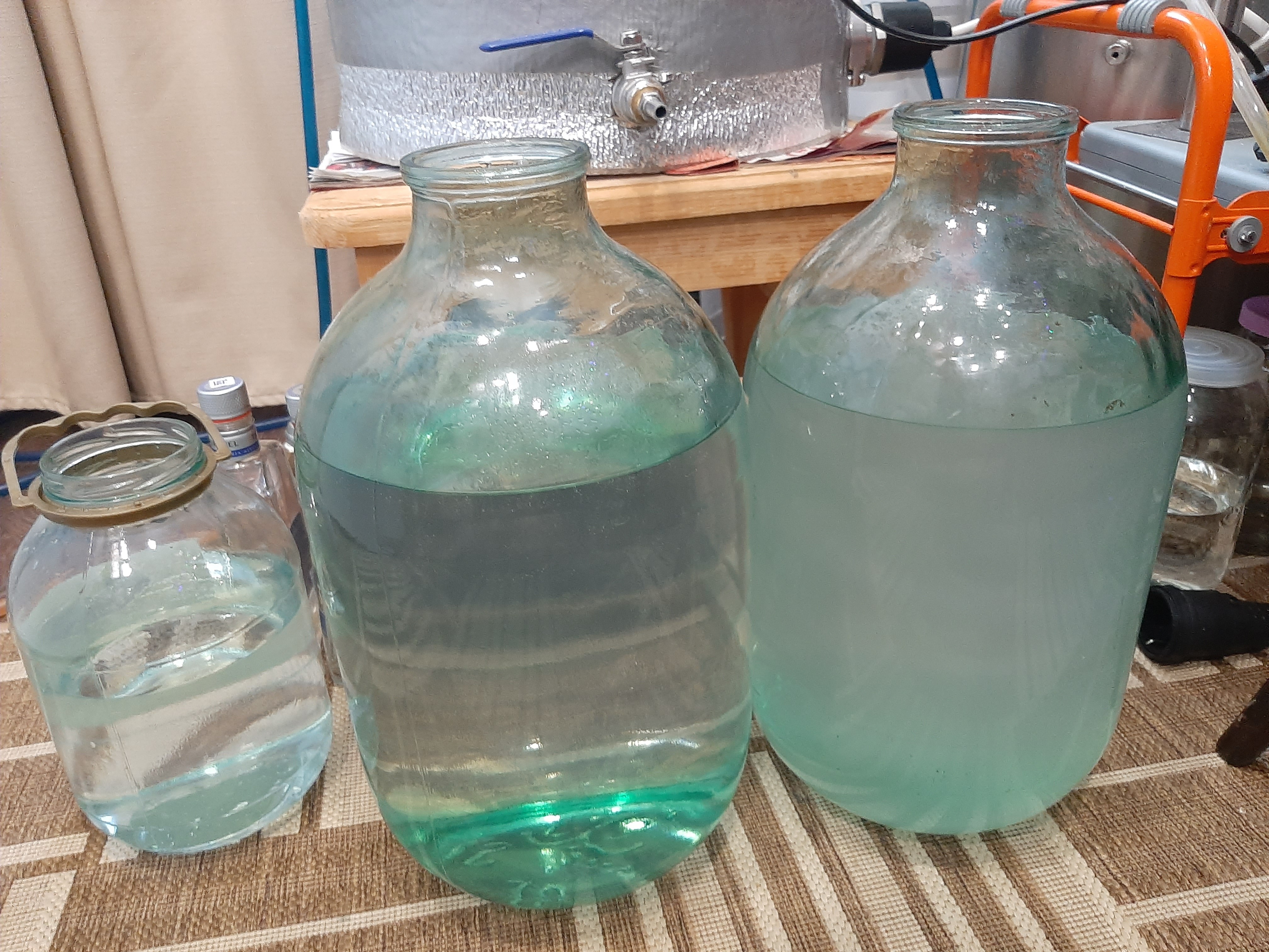 Помутнело в 1й. Есть еще один вариант. Наливал я сначала в мерник из нержавейки, потом в банку. Возможно там были остатки чего-то. До этого головы туда отбирал. Ну хз.