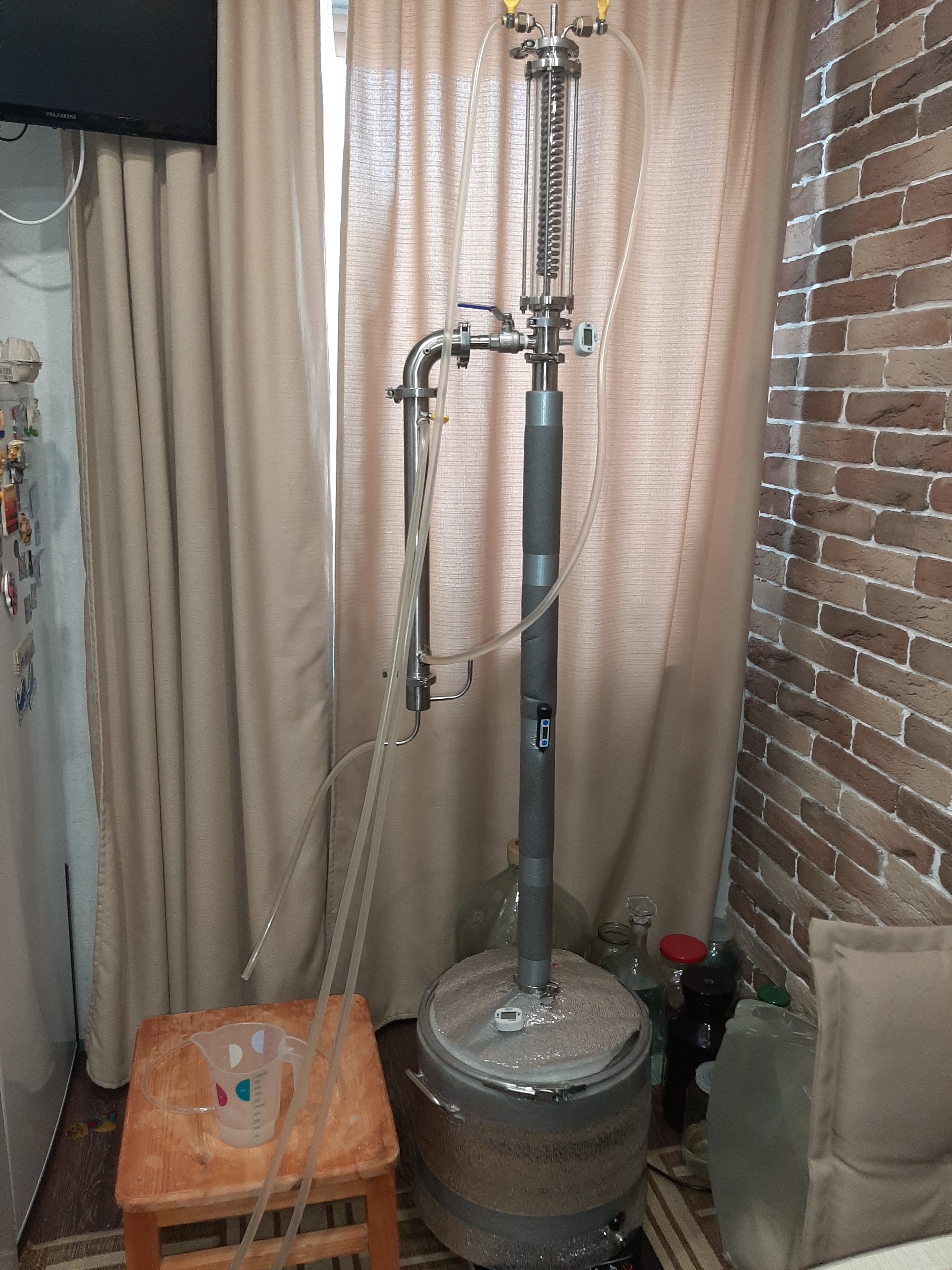 Самовар в базовой комплектации стоит 17 рублей, на фото еще отдельно докупалась метровая царга, спн, стекляная царга, димрот, узел отбора по пару. Короче я давно перестал считать сколько я трачу на все эти дела, ибо оно мне в кайф. А че там описывать? Покупаешь дрожжи кодзи, 9г на кг сырья, гидромодуль 3,5-4 л на кг крупы. Все. Ждешь, гонишь, пьешь. Т на нагревателе 32 градуса