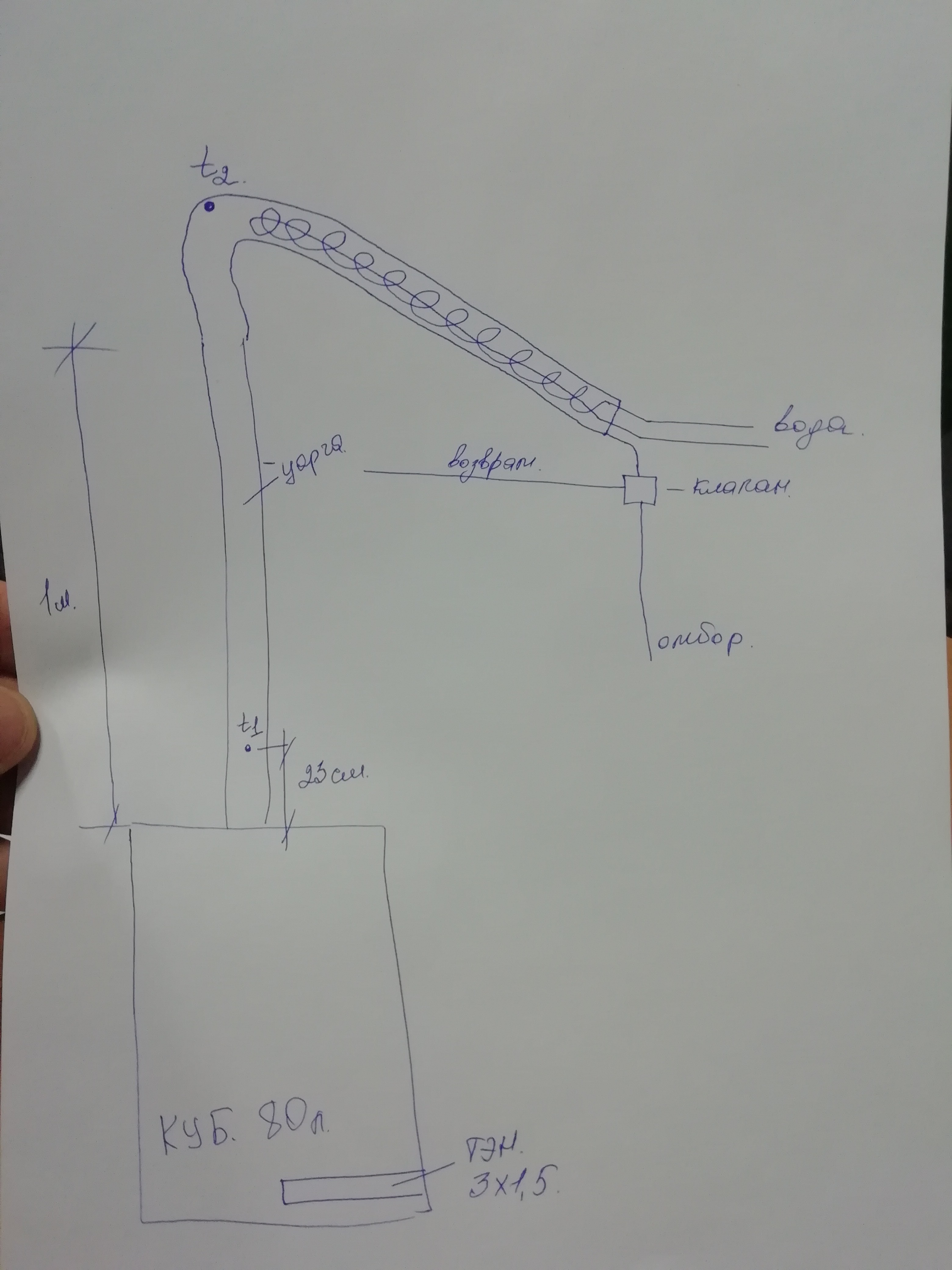 Все здрасьте) Решил темку повеселить) Во вложении "эскизик" моего аппарата. Все ничего но меня очень сильно напрягает процесс отбора голов . да и тела тоже скорость очень маленькая. И ладно головы из расчета 150-250мл/ч , но тело со скоростью максимум 1л/ч это ну меделенно. И все бы ничего скажете Вы мне, но дело в автоматике. А она следующего плана . Сейчас все сделал по замкнутому циклу , те вода гоняется через радиатор насосом. те ничего не сливаю вообще. Внизу колонны стоит термодатчик, на него подцеплен термостат, который управляет клапаном ( клапан работает или на обратку, когда на него ничег оне подается или отбор в момент импульса) . Частота открытия клапана и время его открытия так же регуляруются. Как делаю : 1. врубаю нагрев на 4.5 кВт, разогреваю куб. Как только в кубе 75С, убираю нагрев до 1.5кВт 2. когда пошло испарение , даю поработать колонне на себя, до стабилизации температуры Т1, например 70.8С 3.после стабилизации на терморегуляторе ставлю вилку например 70.8 - 71С , те в этом промежутке идет отбор и настраиваю отбор на покапельно примерно 15-мл/ч 4. после отбора голов рабочий диапазон как правило немного увеличивается и вот тут начинается . 5.Ставлю например 71-71.5С вилку и настраиваю отбор 1л/ч, колонна отбирает 50мл грамм примерно и температура выходит за этот диапазон и отбор прекращается, жду 1-3минуты например пока она спустится и термостат опять отбор включает , те на круг это капец медленно выходит. Пробовал работать на 3кВт, дефлегматор утилизирует эти три кВт но процесс такой же. Посмотрев и почитав нашел немного другую методику, когда температура измеряется в точке Т2 и процесс весь построен именно на этой точке. Сегодня настроил именно на это место измерения , прилепив и теплоизолировав датчик пока что снаружи. Что не так я делаю. царга и деф медные 1.5"
