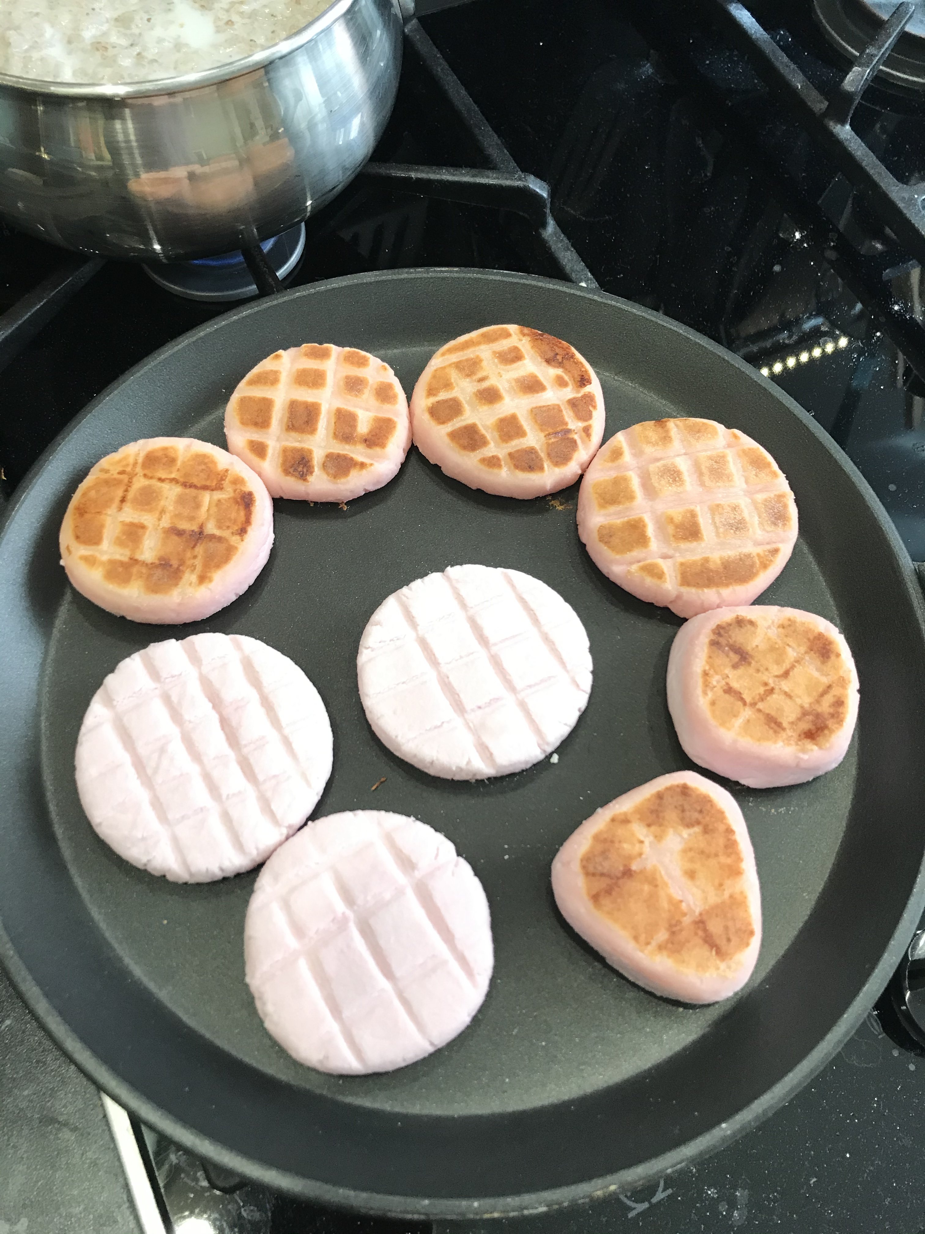 Я познала рисовую муку, отличная тема!) Вот сырники с ней. Творог через сито, сахар и соль по вкусу и по желанию, рисовая мука, для цвета свекольный сок.