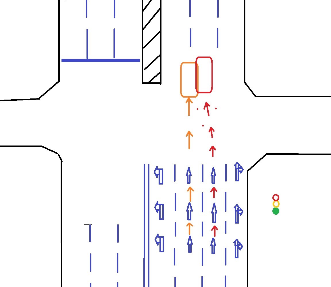 Итак, пока что вырисовывается 2 варианта: 1) обоюдная вина, 2) вина на 100% оранжевого Просто рассуждаю: 1) 1й вариант (если вина обоюдная) .. если вина красного есть (обоюдная с оранжевым), то, получается, чтобы не было его вины, в этом месте он, выходит, должен был уходить В ПРАВЫЙ (после перекрестка судя по разметке) ряд. Но если и там кто-то бы ехал (напр., был бы синий авто в правом ряду ДО перекрестка и в правом ряду ПОСЛЕ перекрестка), то, очевидно и в ДТП с синим была бы его вина (как минимум обоюдная). Т.е., выходит, со второго (ДО перекрестка, считаем с правой обочины) ряда в любом случае будешь виноват в ДТП (как минимум обоюдно), как бы ты не ехал? после светофора там три полосы. Судя по существующей разметке, да даже по приведенной мной ссылки на панораму улицы это видно. Ну ОК. Также давайте рассуждать. 2) 2й вариант: Пусть виноват на 100% оранжевый. Но если бы он ПОСЛЕ перекрестка оказался в центральном ряду, то, выходит, исходя ИЗ ТАКОЙ ТРАКТОВКИ, его вины бы не было, или была бы как минимум обоюдка? Я правильно Вас понимаю? Т.е. опять получается, что красному, чтобы не быть хотя бы частично виноватым в ДТП, в НЕ ЗАВИСИМОСТИ ОТ выбранного из 2х вариантов, деваться ПРОСТО НЕКУДА. Нужно стоять и ждать, пока слева и справа все проедут?Только это ему гарантирует отсутствие, пусть и обоюдной, но вины в ДТП? Но при этом он нарушает пункт ПДД об остановке на перекрестке...