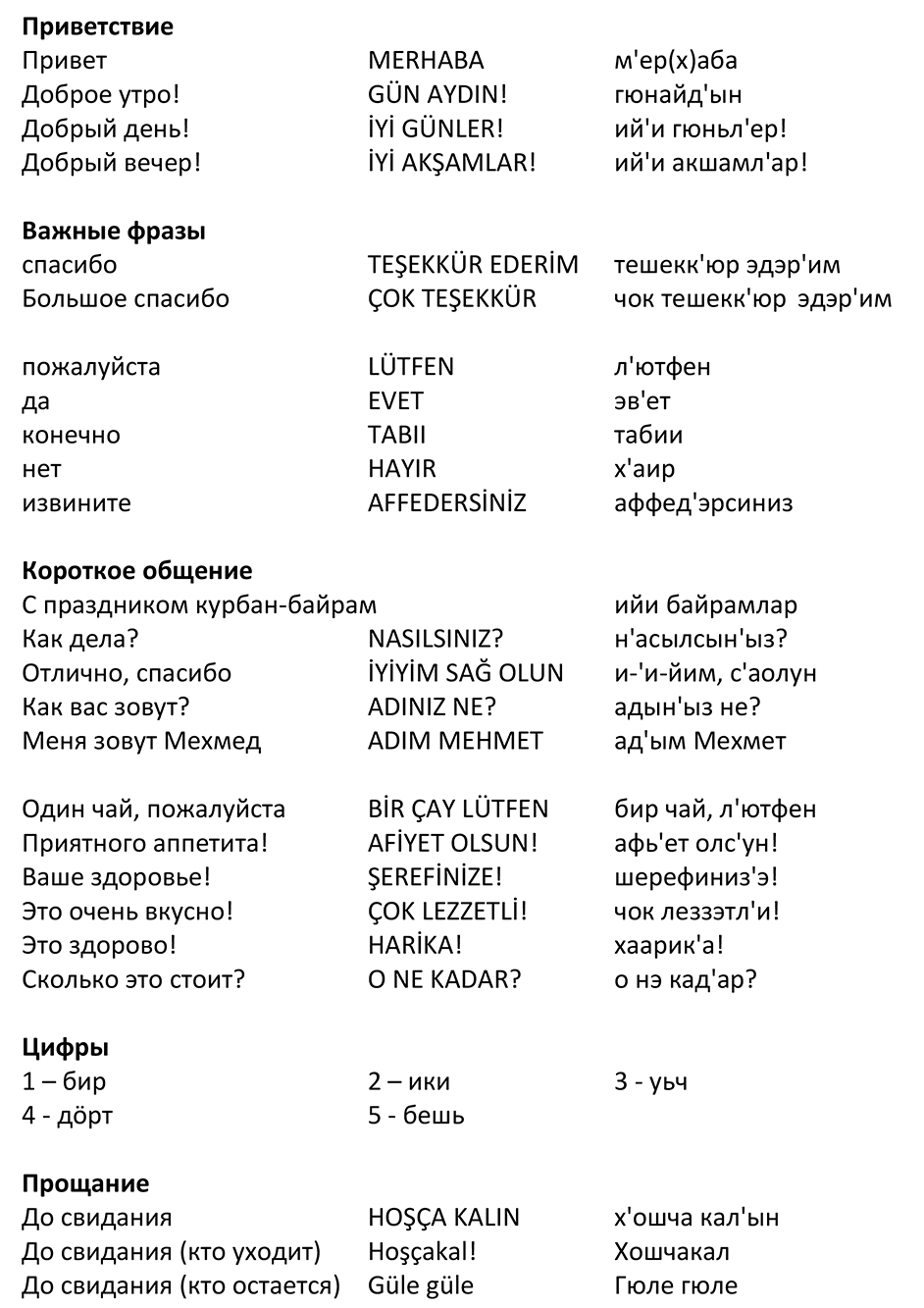 Кстати, удивлён, что всё же есть билеты прямые из Волгограда в Анталию. Видимо, сезон схлынул и с чартеров излишки продают. · В самолёте теперь не кормят — берите платное питание, оно недорогое — 200 руб/человека, если не хотите потерпеть. · Расплачиваться везде можно картами (про МИР не знаю). Идеальный вариант — на карте мультивалютный счёт в лире и платить с неё. · Если наличными, то выгоднее поменять на лиры и платить ими. Например, в автобусе (проезд 4 лиры) мне с доллара (1$=5 лир) сдачу не давали. Но если валютой, то платить $ лучше, чем Евро, т.к. они часто номинируют в одну цифру — 1$ = 1€. · Выучить несколько местных слов — хорошая манера. Хотя бы Мераба̀ (привет) и Тэшшекю̀р эдерѝм (спасибо). Стартовый набор прилагаю. · Многие понимают русский, почти все английский. Младший персонал (уборщицы) — только по-турецки. А вообще, турки необычайные полиглоты и «торгаш» или аниматор, разговаривающий на 5-10 языках — это норма. · Оставить на чай — хороший тон. Я перед поездкой меняю валюту в Сбере — там можно попросить мелкими купюрами. Оставляю 10-20$ на стойке при заселении (прошу хороший номер), 1-2$ носильщику, уборщицам. Можно на стойке бара (я не оставлял). · При заселении спокойно можете попросить показать другой номер, если этот чем-то не устраивает (вид из окна, соседство с шумом). · На телефон Гугл переводчик с загруженным словарём и Maps.me с автономными картами. · На предложения тургида особо не вестись, страшилки не слушать. Можете спокойно приобретать экскурсии на улице, но лучше заранее изучить у кого (в ВК, и т.д.) · Воду из-под крана не пить. Чистить зубы с бутилированной водой. · В аптеках турции лекарства дешевле и лучше русских. Многие ими затариваются. Но антибиотики только по рецептам. · В стоимость мед.страховки заложена франшиза 30$. Вы их заплатите при вызове врача. Остальное бесплатно, даже лекарства из аптеки. Главное сохранить рецепт и детальный чек с теми же наименованиями, что и в рецепте — их предъявите в страховую для компенсации. · В мед.страховку не входят активные виды спорта. Поэтому, если разбили подбородок, катаясь с водных горок — не признавайтесь. Говорите, что поскользнулись на дорожке. · Пожалуйста, держите себя в руках при виде шведского стола. Возьмите чуток. Понравится — подойдёте ещё. Часто какое-то блюдо может оказаться непривычным, а оставленные горы еды — не ком-иль-фо. · Свинины не бывает нигде. Зато вкусна индейка в разных вариантах. В нормальном отеле — баранина, телятина. Желаю вам хорошего отдыха и приятных открытий.