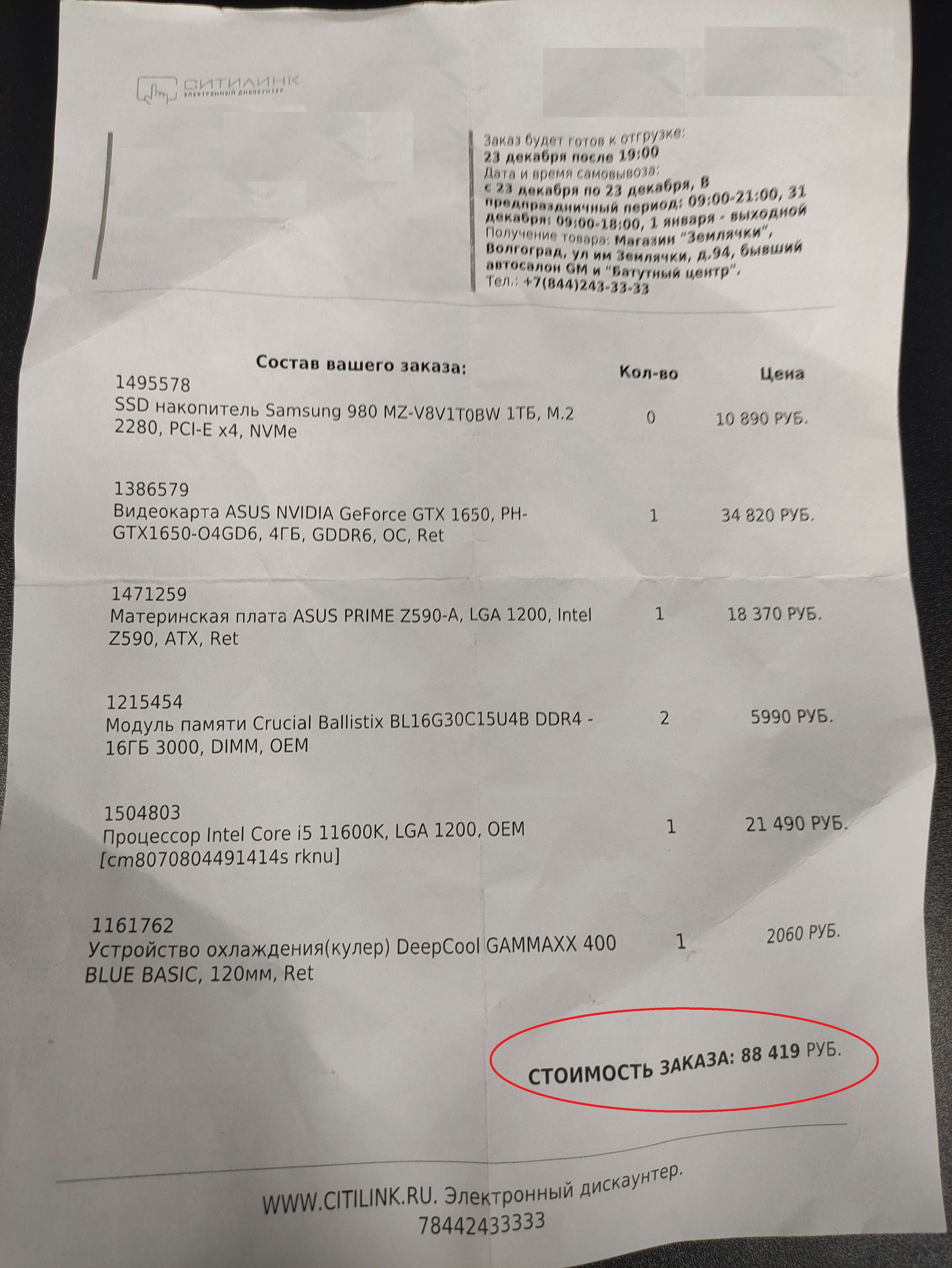 20.12.2021 сделал заказ на ворох комплектухи. По всем правилам предпраздничных скидок, с промокодом NEW2022 и самовывозом с Батутного. Вместо ~96 тыс. руб. ценник сначала при заказе уменьшился до ~93т., а после до окончательной стоимости - 88.419р. Спасибо, догадался сразу распечатать. Приезжаю вчера (23.12.) всё забирать, мне на кассе озвучивают цену - 96.620 р.!!! Минут 20 общался с "горячей линией", в результате составили обращение, мол, ждите вердикта в течение 48 часов. Посмотрим...
