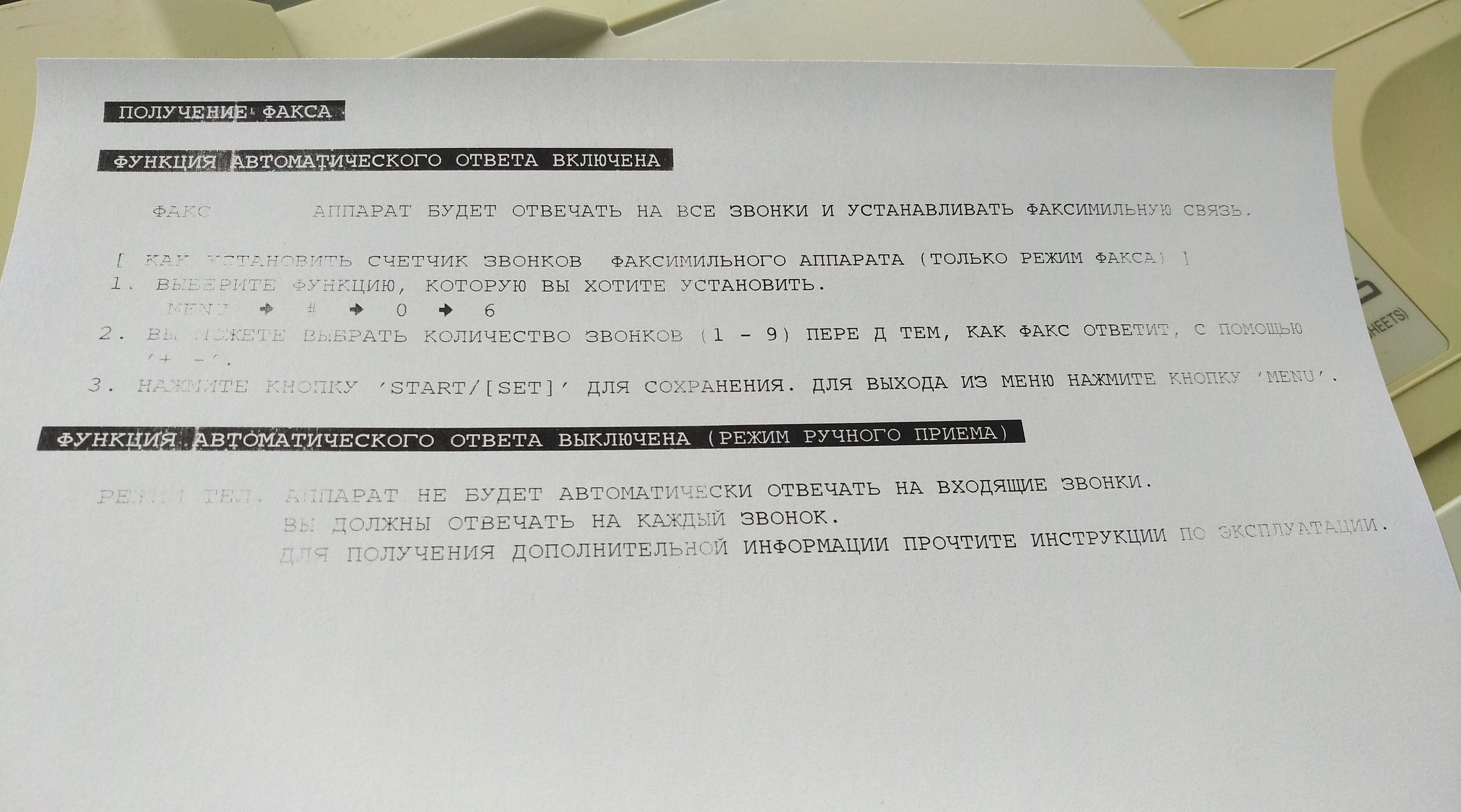 Откопал в кладовке динозавра, если кому нужен - забирайте, иначе все равно в мусорку пойдет. Лазерный факс/принтер/сканер, характеристики тут. Был рабочий, но долго лежал без дела. Проверил только работу копира, возможно нужно менять барабан, качество печати видно на фото. Сканер и принтер имеют драйвер максимум под Висту, поэтому не проверял их, как факс тоже не проверял. Забирать в районе Дворца Спорта, связь в теме или в ЛС.