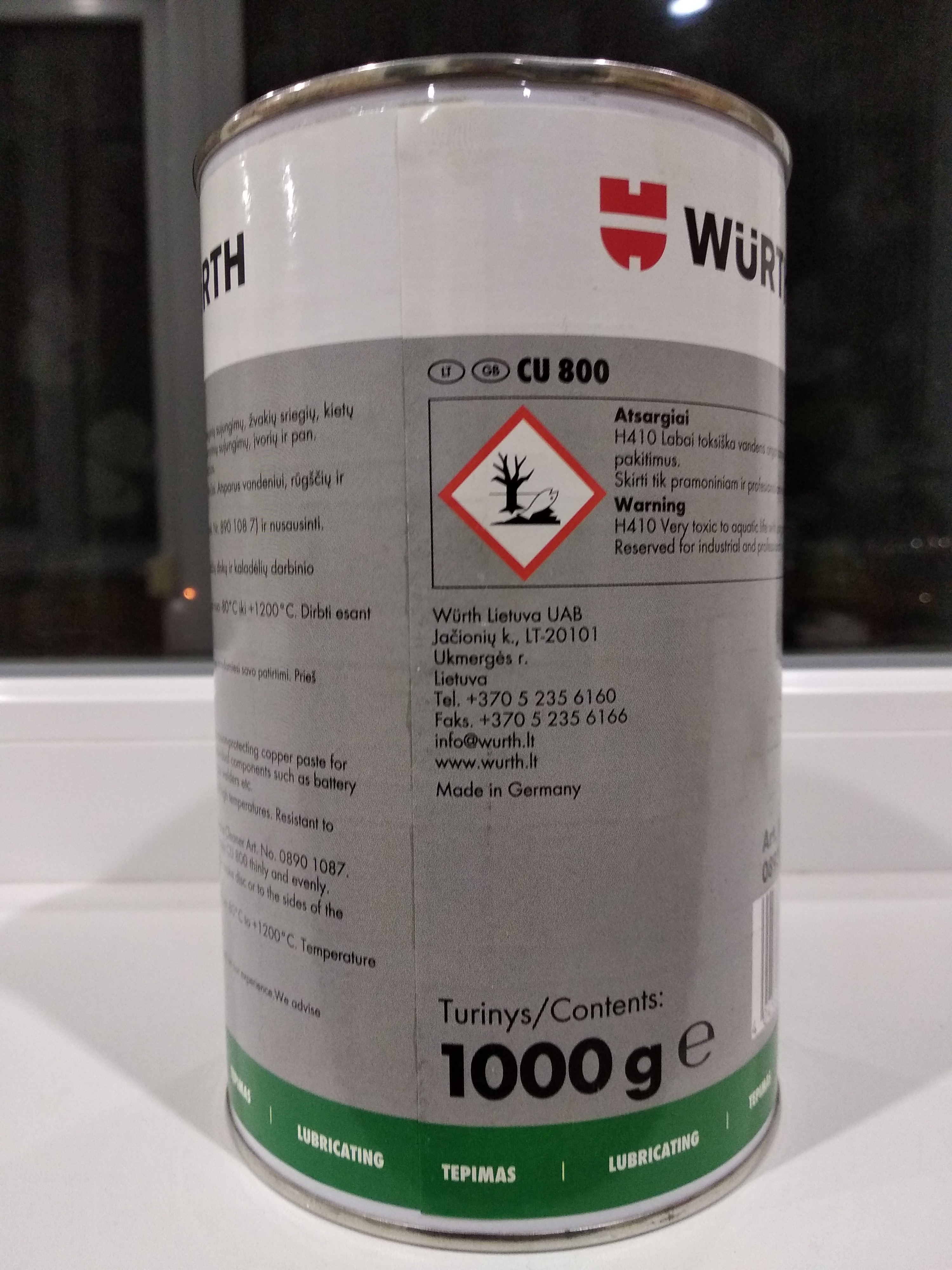 Упаковка 1 кг. Банка помятая . Видно на фото. Целостность тары не нарушена. Цена 3 150 руб. Медная паста CU 800 — Вюрт Маркет При покупке вместе с Продам смазку WGF 130. WURTH. скидка 7%. За два товара. Дополнительно при покупке вместе с Диски по металлу Wurth 125 мм. скидка 10%. За все три товара.
