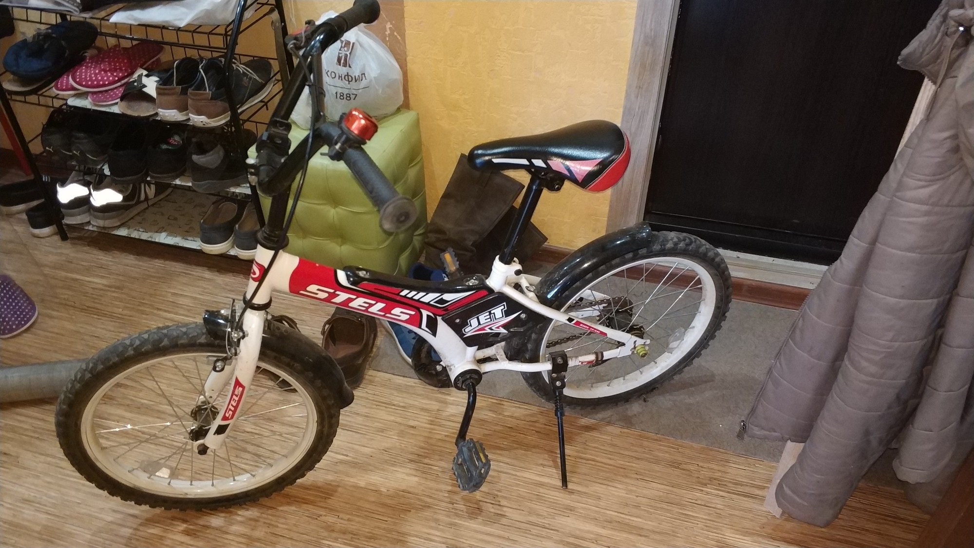Купили сыну в том году, а он резко в рост пошел и велик стал мал, поэтому продаем. Катались по сути 2 месяца. Состояние на 5- или 4+, кому как нравится ))) Для удобства использования куплена и установлена подножка. А чтобы видеть ребенка в сумерках, на колесе установлена светодиодная крышка на нипель колеса, которая начинает светится при вращении колеса. Цена 3999 рублей