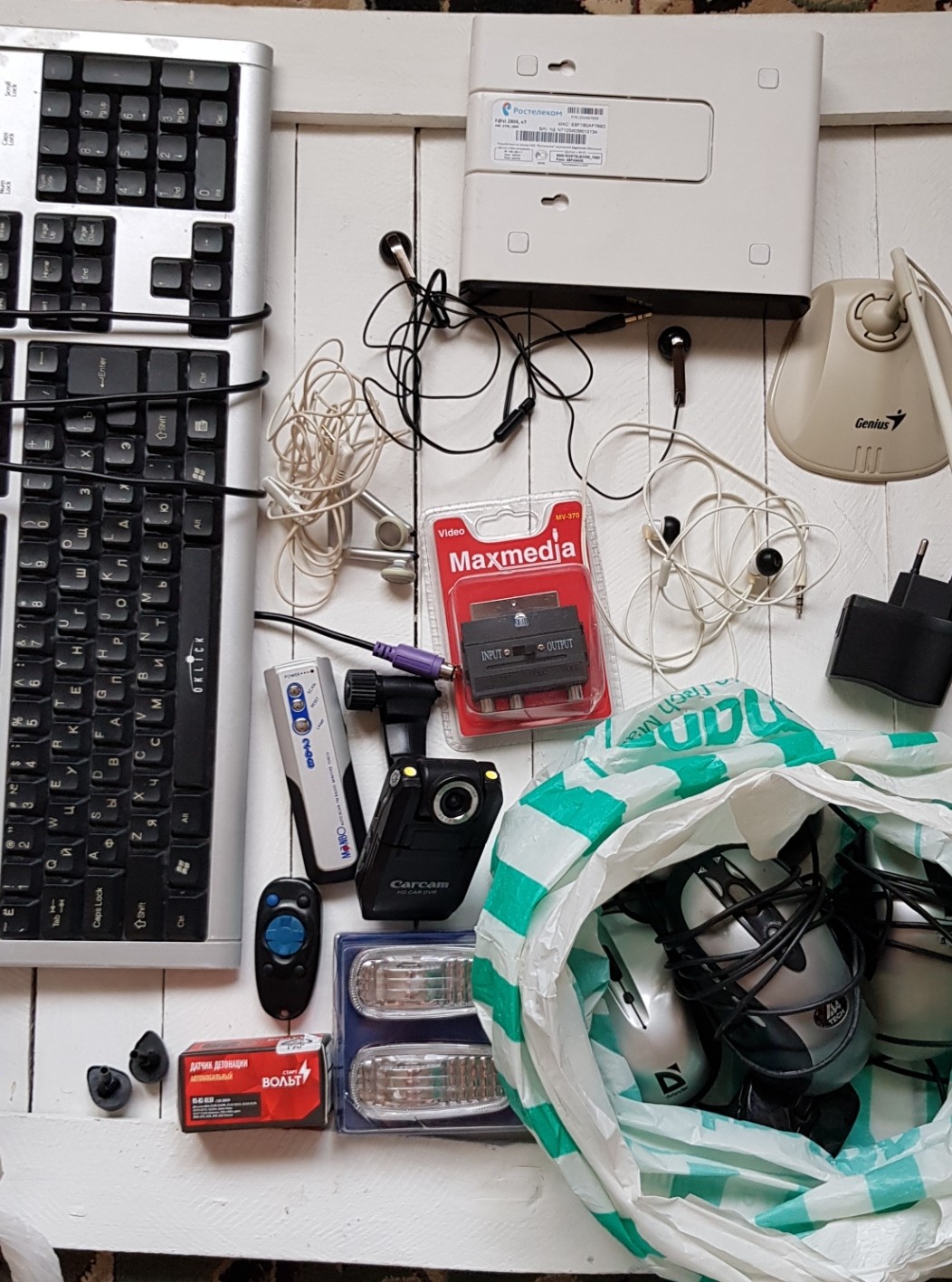 На фото. Часть неиспользованное, часть полу- и нерабочее (т.е.хлам) (Мыши, клавиатура, видеорегистратор, наушники, роутер Ростелеком, новые датчик детонации Ваз и боковые поворотники) и др. Крайне желательно всё в одни руки. Забирать в Ворошиловском, ул. Елисеева.