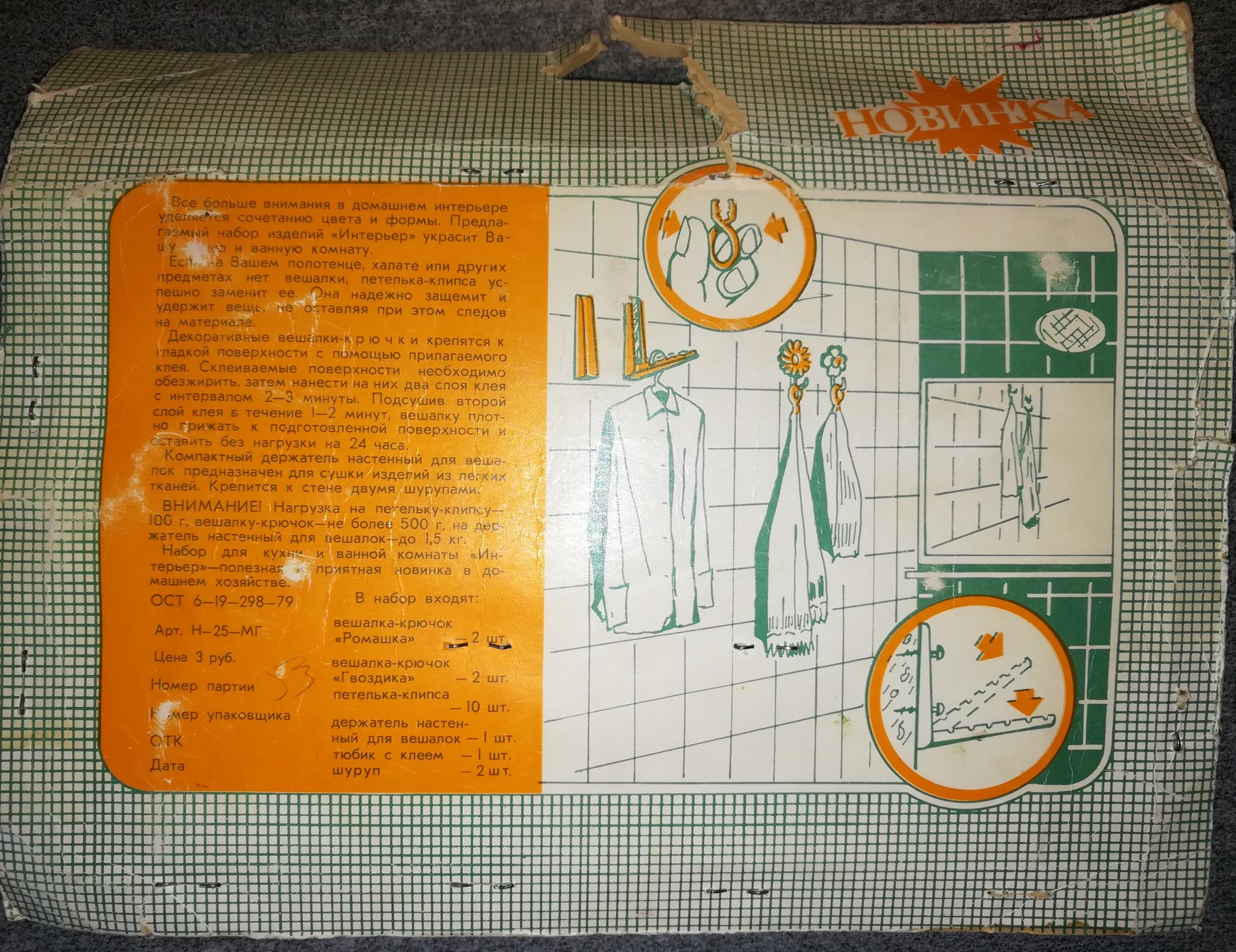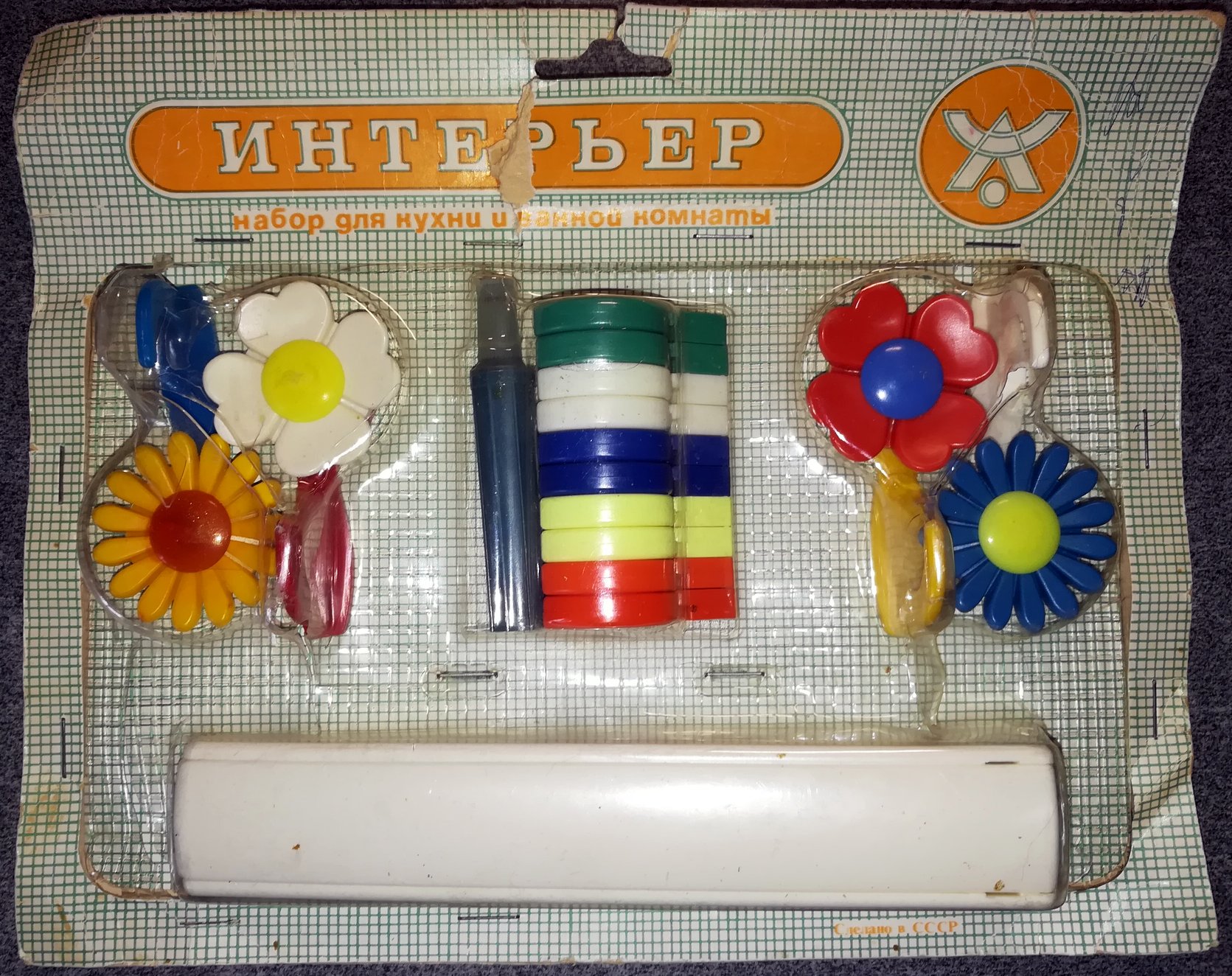 Отдам раритетный советский набор для кухни и ванной "Интерьер". В набор входят: 1. Вешалка-крючок "Ромашка" - 2 шт. 2. Вешалка-крючок "Гвоздика" - 2 шт. 3. Петелька-клипса - 10 шт. 4. Держатель настенный для вешалок - 1 шт. Забирать из центрального района. Сок приветствуется.