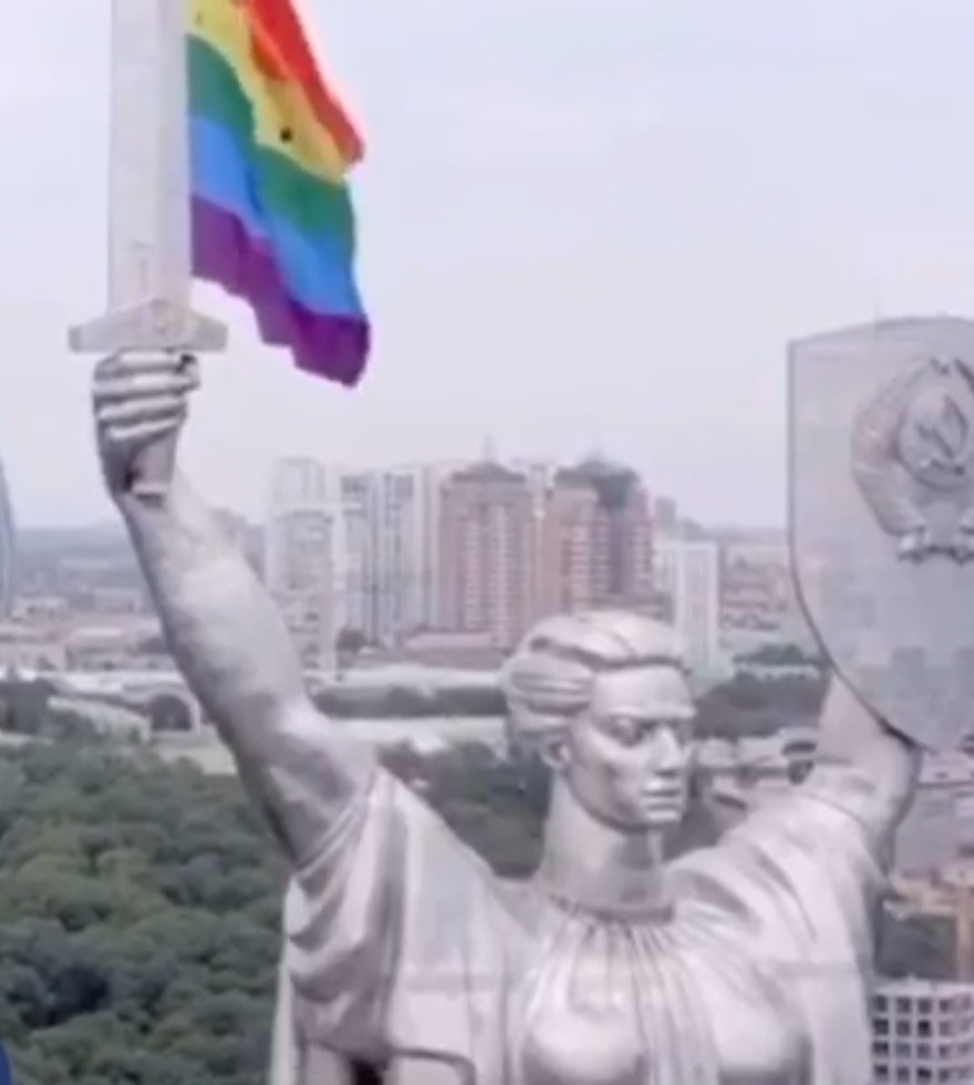 Ну во-первых, это не гомосячий флажок. Во-вторых, есть видео, дроном повесили. В-третьих, что вы так нервничаете? Достопремичательности, памятники, арки часто подсвечивают различными флагами в честь разных событий. В Киеве прошел прайд парад. Для них это значимое событие