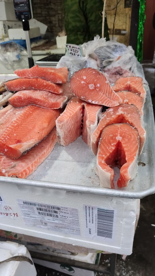 Зачем же покупать с этой кучи? Где все мороженное-размороженное.Я ж говорил два места слева и одно справа. Все благородно ,чисто , и при вас с ящиков со льда .ну ее ж видно рыбу .Да -она у них подороже чем у других 1000 -1300 р. Но прям класс и стейками сделают. Не знаю имеет ли это отношение к рассуждениям о рыбе но в ВЛГ я приехал в 1984 году получать профессию -судовой повар . И отучился на Баррикадной . Училище N2 река-море . Вечером после работы на ЗКО ездил на учебу Потом практика .Получил диплом и вызов на Архангельский рыболовный флот .Но в последний момент сорвалось.Семья .Так что как кок -я не состоялся. Но про продукты кое что понимаю.Повторюсь -ее ж рыбу -видно и так и этак. По всем статьям на ярмарке она лучше чем то что я видел в гиперах. Может вам видно другое-ааше право
