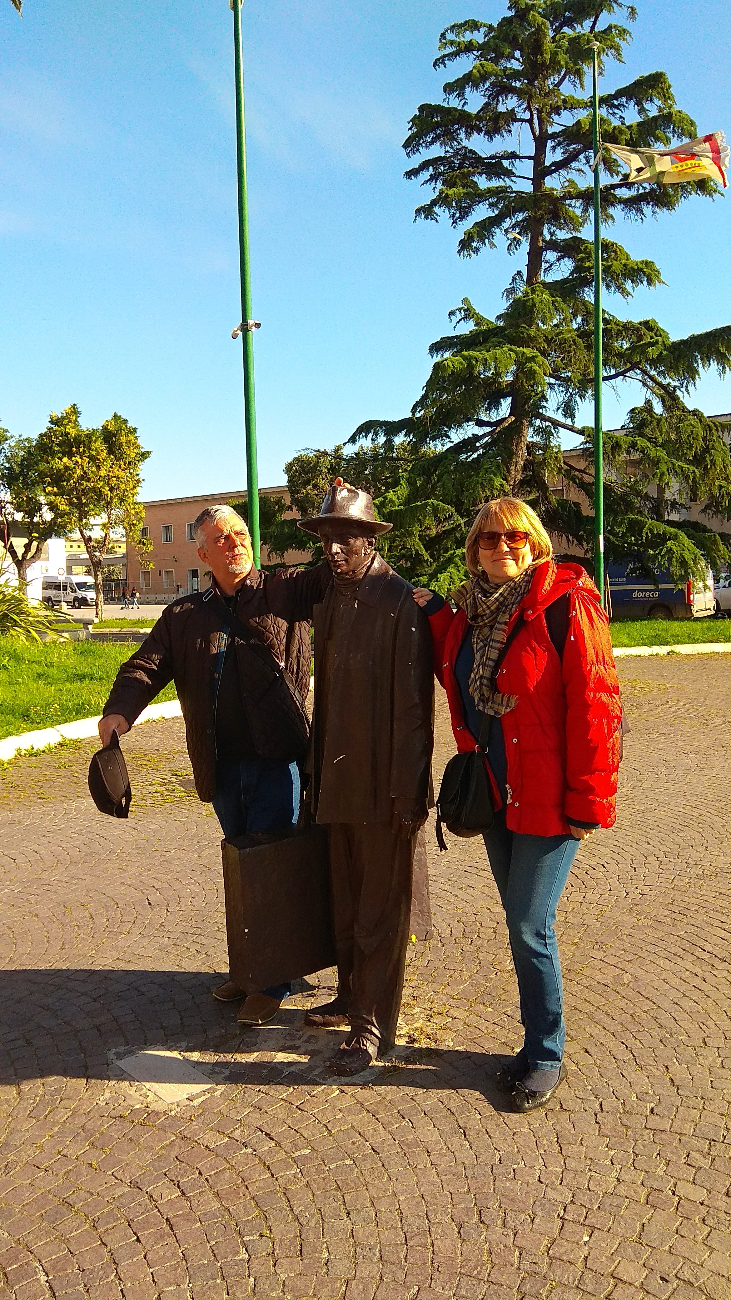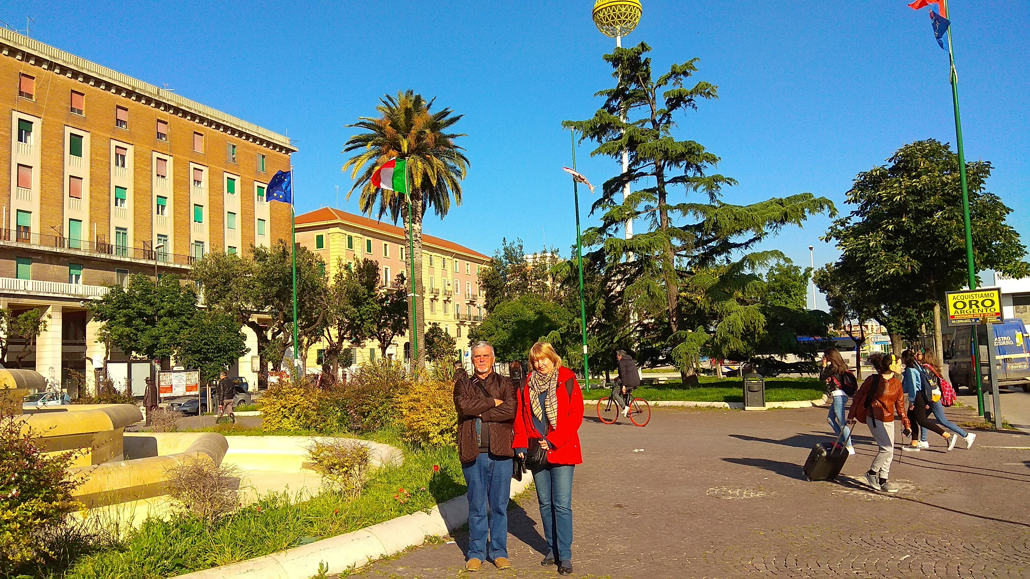 Ну вот. Как то и время летит. Отпраздновали Д.Р. брата в пиццерии с родней . Подошел 15 день нашей поездки . С грустью собираемся в обратный путь . Багажа прибавилось нехило так. Выезжаем из Сан-Джованни вчетвером на автобусе до Фоджи. Василий с женой изъявили вместе с нами погулять по Риму. Но у них билет по 4 евро из Фоджи до Рима на автобусе. У нас 51 евро за 2 на поезде. Мы выезжаем на час раньше их . Билеты у нас в музеи Ватикана с посещением ресторана на 14.00. А они только в 14 прибывают. Договариваемся созвониться. А пока хоть немного глянем эту Фоджу -пока поезд на подошел.