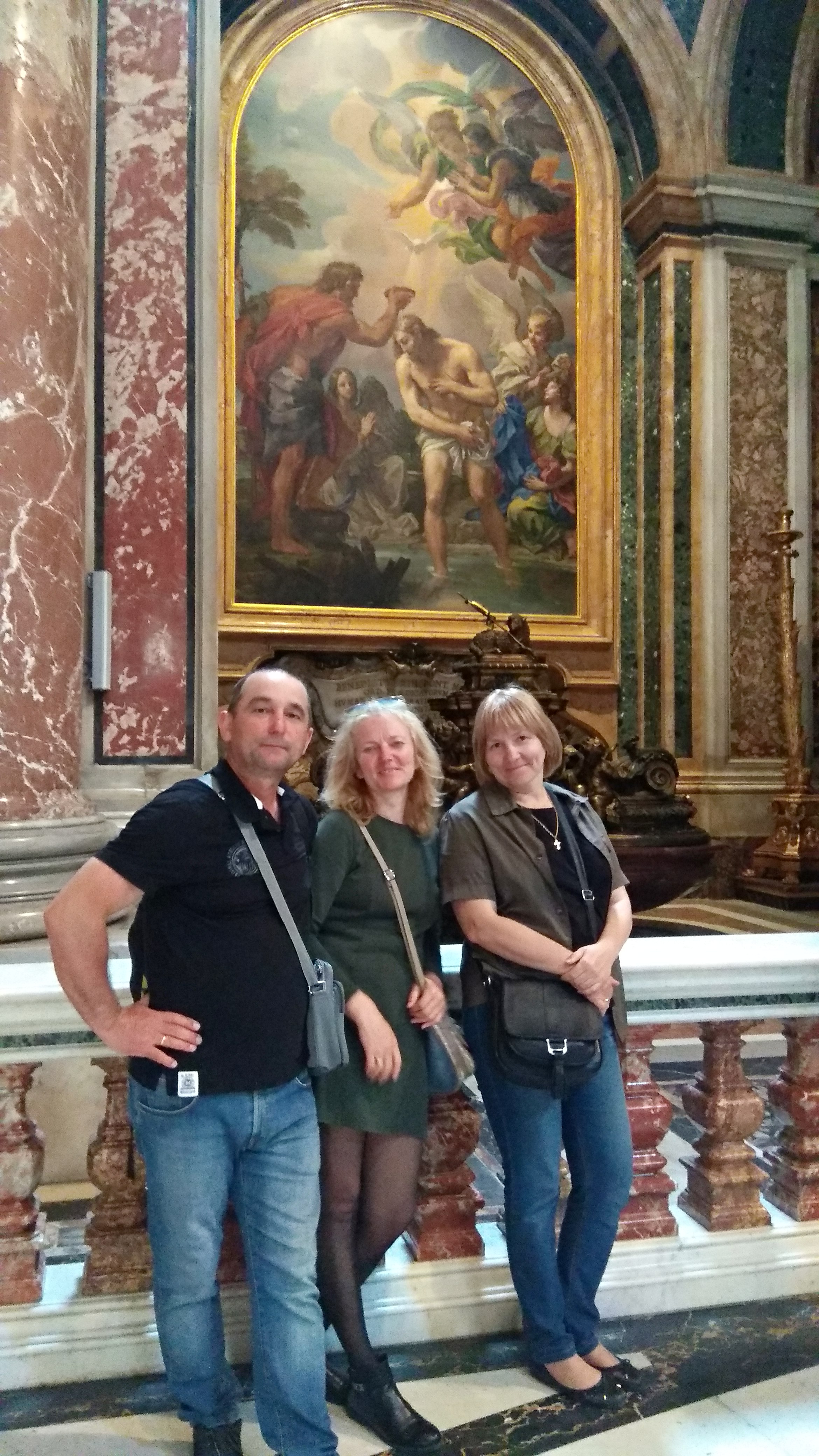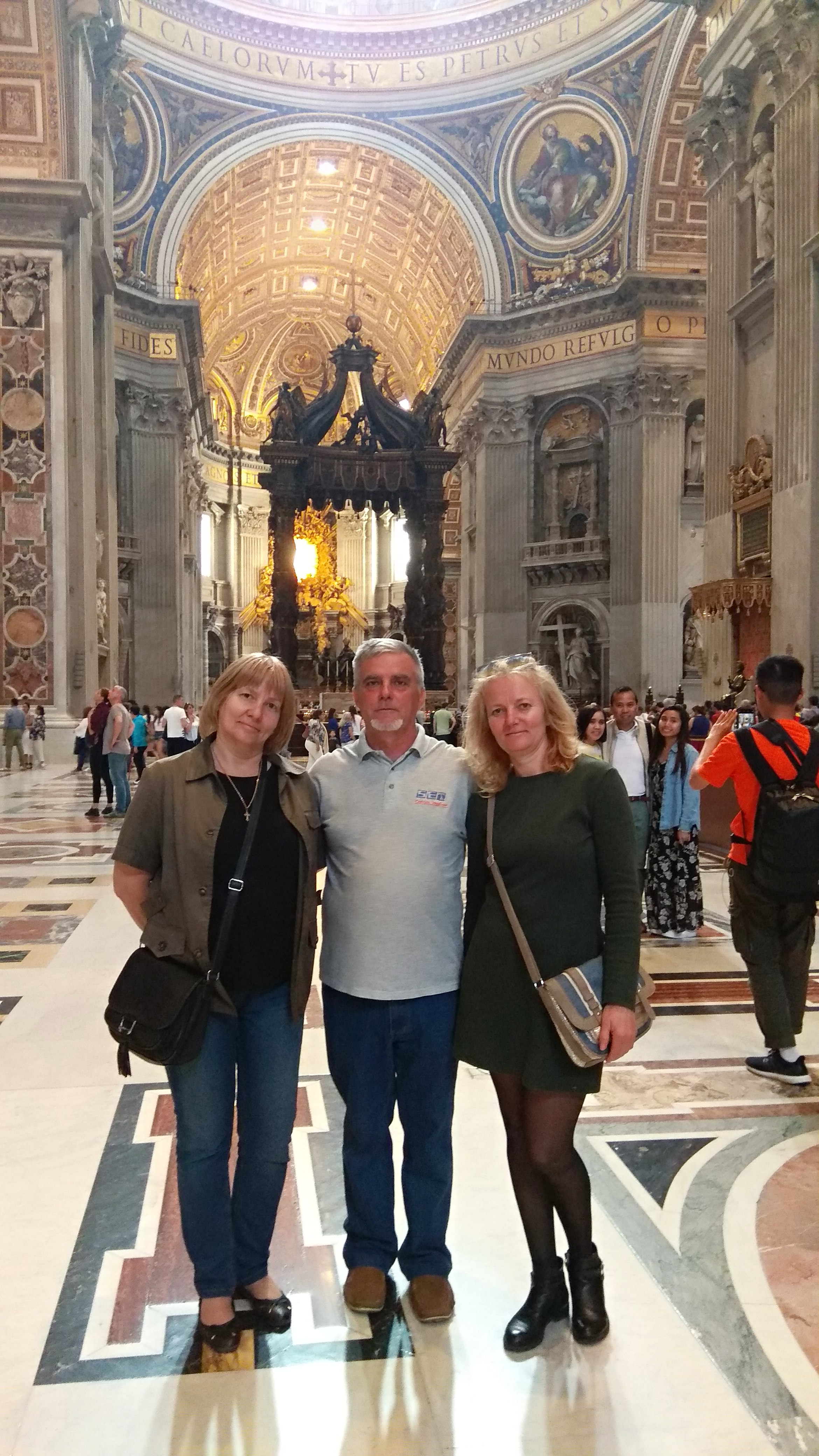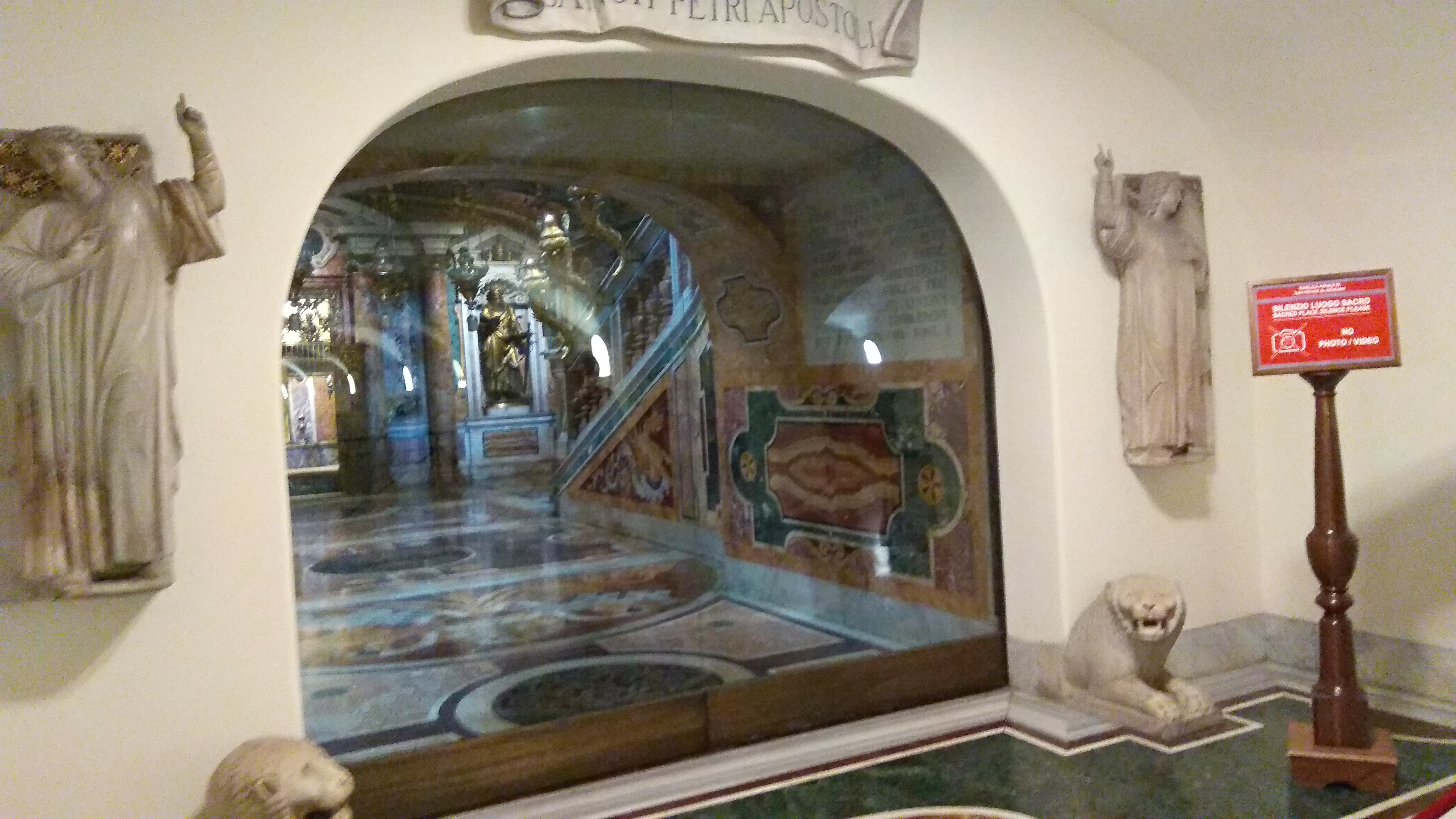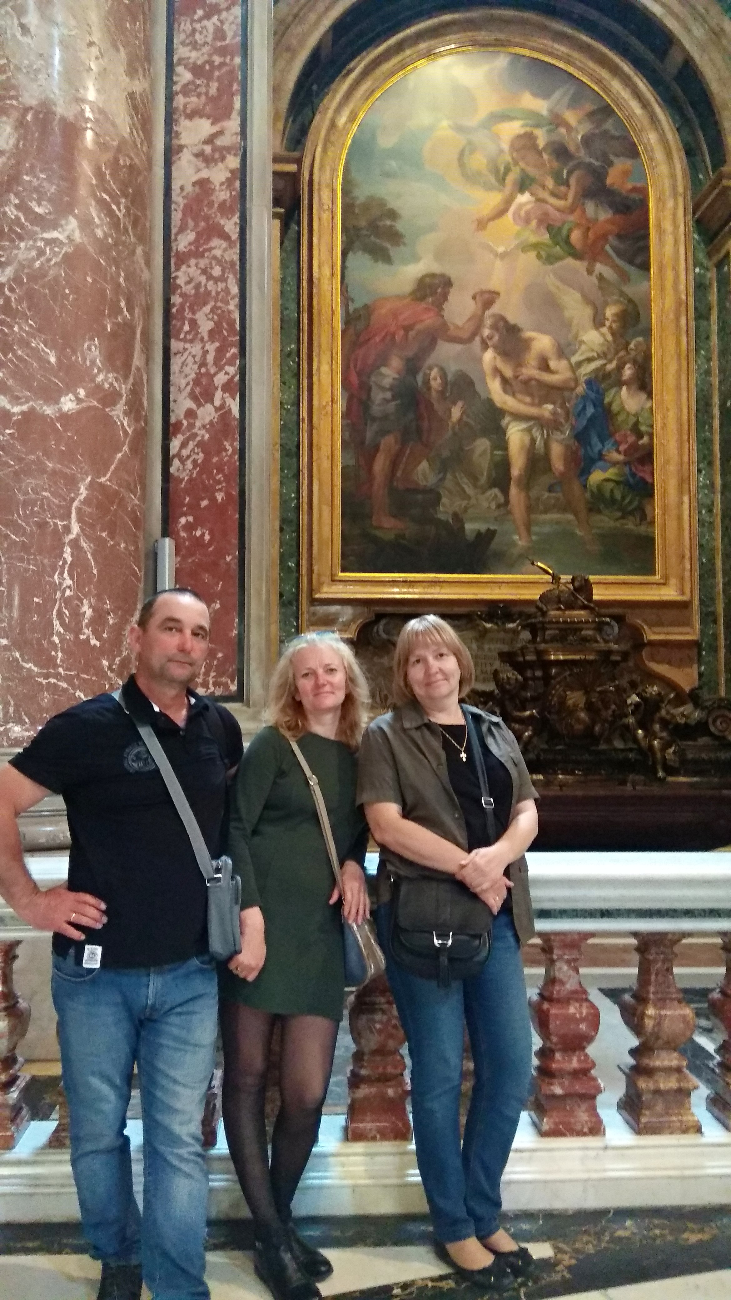 Ну надо же ! Предрасполагали-договаривались созвониться- что встретимся с братом и его женой в соборе ! А встретились случайно. Они зашли с улицы-вход бесплатный. Мы же через музей и Сикстинскую капеллу . И это хорошо.Иначе сами и не нашли бы незаметный вход под землю где захоронены предыдущие Папы Римские -прошлых времен. Зашли. Услышав нашу украинскую мову -к нам подошел охранник. Земляк ! Хахол- живет и работает в Риме. Рассказал немного подробностей а мы поснимали. Наслаждаемся шедеврами собора. С восторгом узнаю что это всё МОЗАИКА ! Кругом мрамор и композиции которым много веков.Потрясающе !