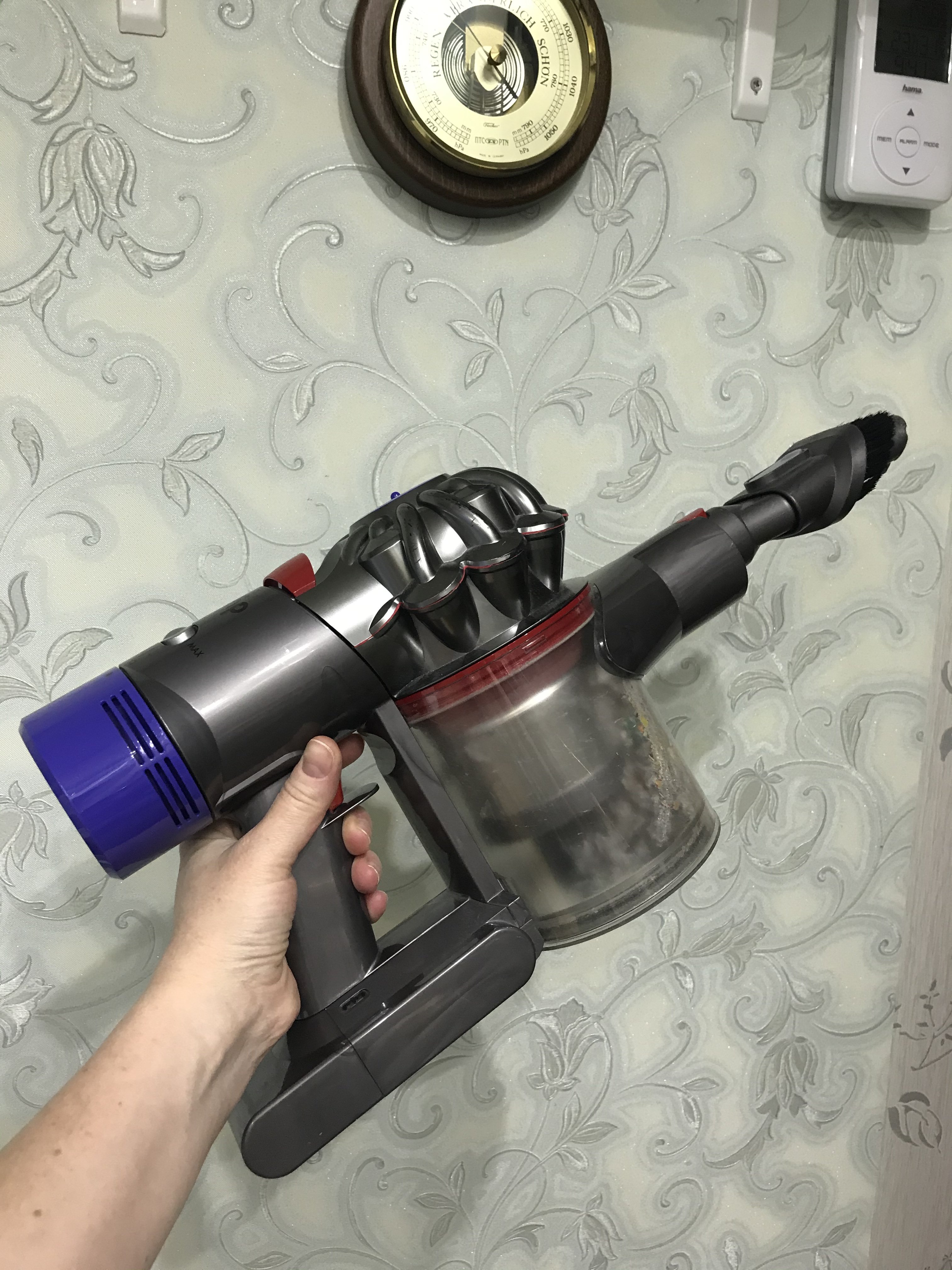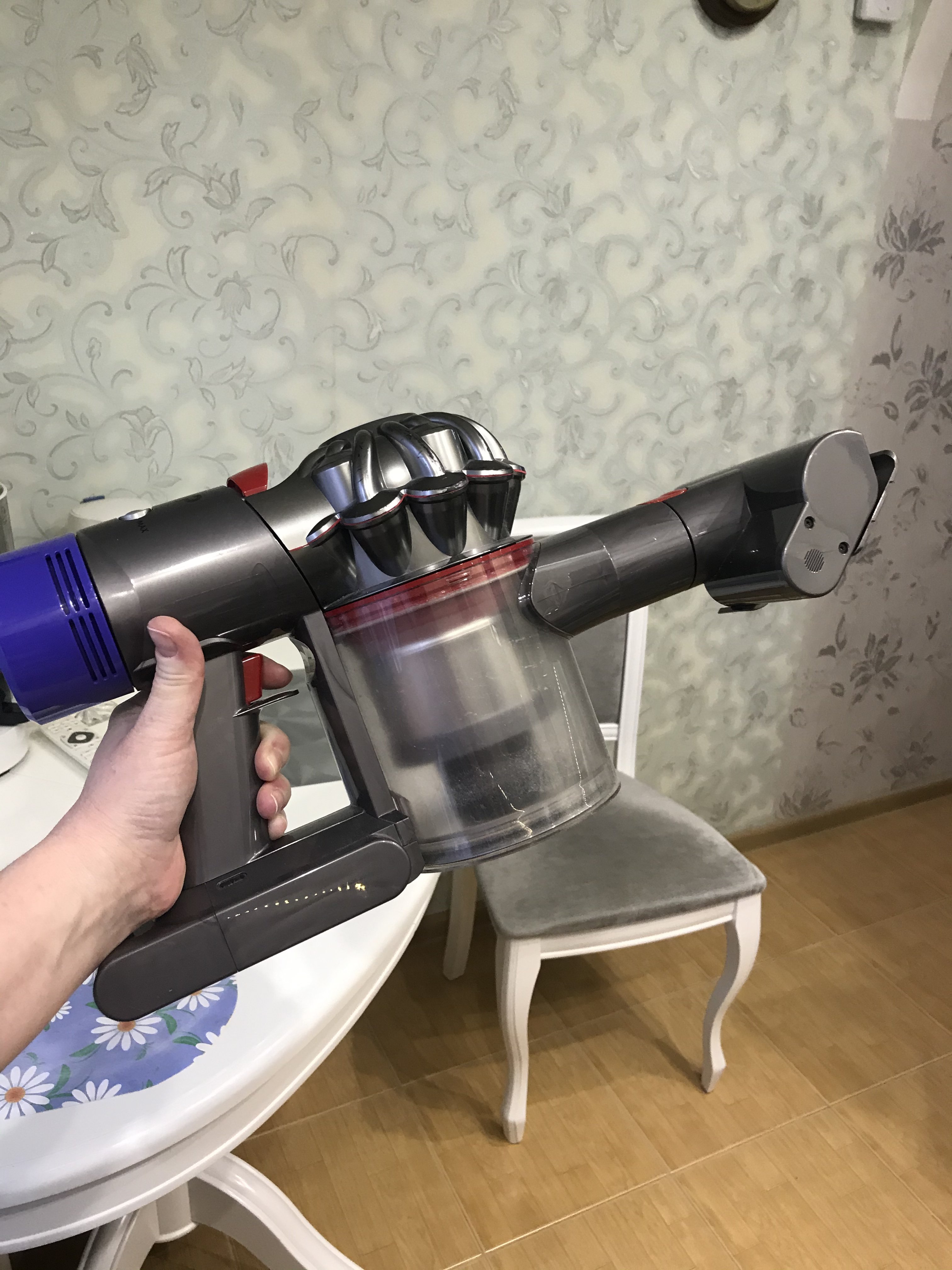 Пишу пишу) Только я пишу про ручной, в нём нет недостатков)) Первый Dyson dc35 мы купили очень давно, он работает до сих пор, меняли только аккумулятор. Альтернатива венику, быстро что-то убрать собрать, задумались об этом когда попугая приобрели и он линял). Пошли в магазин именно за ручным, маленьким автомобильным, но продавец, спасибо ему большое, уговорил на дайсон ручной. Следом, купили моющий Bissell 7700j, тоже супер автомат, и моется он тоже хорошо. Его пользовали по выходным, и пылесосили и мыли. Далее, как выше написано, накопила я денег и купила Dyson V8. Dyson V8. Да, он чуть потяжелее уже чем dc35, но и более совершенен. Работает уже 40 минут, с турбощеткой меньше. Колба сбора мусора больше, вытряхивается легко в унитаз, по мере необходимости моется легко и быстро. Есть режим увеличения мощности всасывания, иногда пользуюсь. Насадка для мебели, супер, стулья мягкие, матрасы - отлично вытаскивает пыль, фото найду, покажу. Пыль как мука в колбе. Тонкая началка, щели, плинтуса отлично. У меня в обиходе обычная стандартная началка, ежедневно беру в руки пылесос и не один раз за день. Иногда бегаю с турбощеткой. Воздух из него выходит чистый, ничего не воняет. Справляюсь держать его одной рукой вполне. Пробежавшись им по всей квартире, полы потом протираю, на тряпке мусора нет, вода чистая. Крошки, волосы, что-то рассыпал крупу, муку, дети поиграли, на подоконнике, под батареями, на мебели, и пыль и мусор какой-то и тд., жизни уже не представляю без этого пылесоса. Началка, насадка))