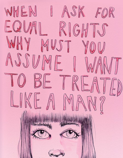 Если имелось ввиду это: Когда я прошу равных прав, почему вы непременно решаете, будто я хочу, чтобы со мной обращались как с мужчиной? То втут есть нюансы .. Равные права = равные обязанности? Возможно ли? з.ы. Если женщина носит автомат и готова стрелять во врагов, она должна быть готова быть убитой или нет? Если женщина кинулась в драку .. ? Тут дело кагбэ не во взглядах.. imho