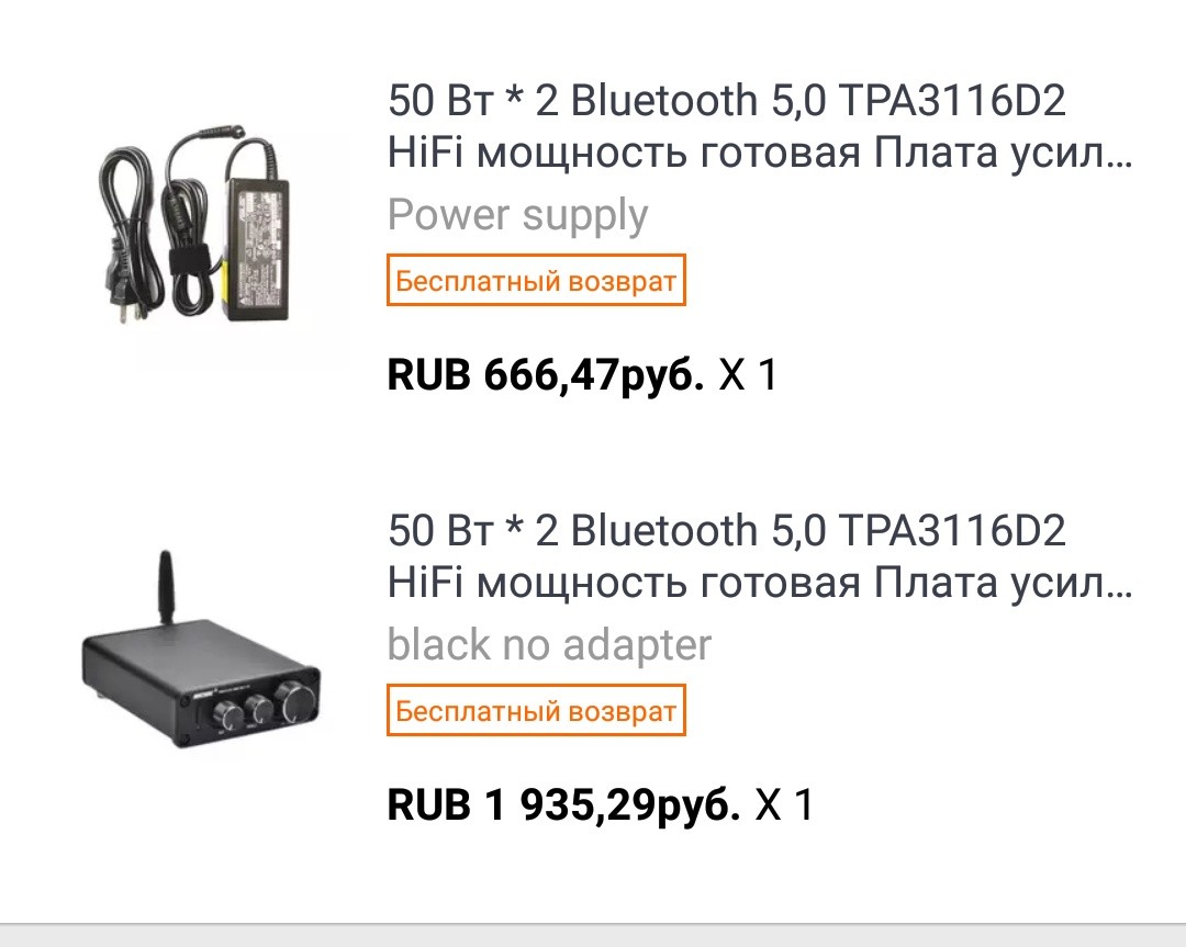 Ну протестировали у тебя. Понял что вещь? Пока ты тут думал, в тмоле все ращобрали . В Китае тоже подорожали! Полный аналог моего училка, этот 637.49 руб. 35% СКИДКА|50 Вт * 2 Bluetooth 5,0 TPA3116D2 HiFi мощность готовая Плата усилителя в случае домашнего аудио TPA3116 усилитель с тройным басом T0712-in Усилитель from Бытовая электроника on Aliexpress.com | Alibaba Group Блок питая можно там же заказать. На тмолле был такой. Тоже по сути самое, 3 093,89 руб. | KGUSS BL50PRO TPA3116D2 QCC3003 Bluetooth 5,0 мини аудио цифровой для домашнего кинотеатра, усилитель 50 Вт + 50 Вт 3 093,89 руб. | KGUSS BL50PRO TPA3116D2 QCC3003 Bluetooth 5,0 мини аудио цифровой для домашнего кинотеатра, усилитель 50 Вт + 50 Вт А так на Али искать TPA3116D2 и смотреть похожие внешне коробочки. Что бы три регулятора было. Громкость, низы и верхи. Ща вроде скидки пишут, но в приложении нет. Может при заказе через сайт.....