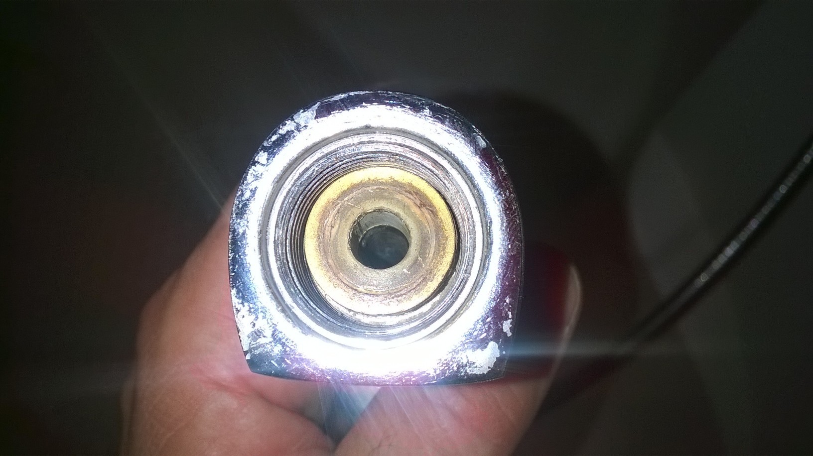 так там везде металл. И держатель и гайка шланга металлические. то, что с резьбой - гайка шланга. Снаружи - держатель. Он круглый, диаметром чуть больше гайки. Латунная часть - штуцер самого шланга. @Зуб, лимонкой попробую.