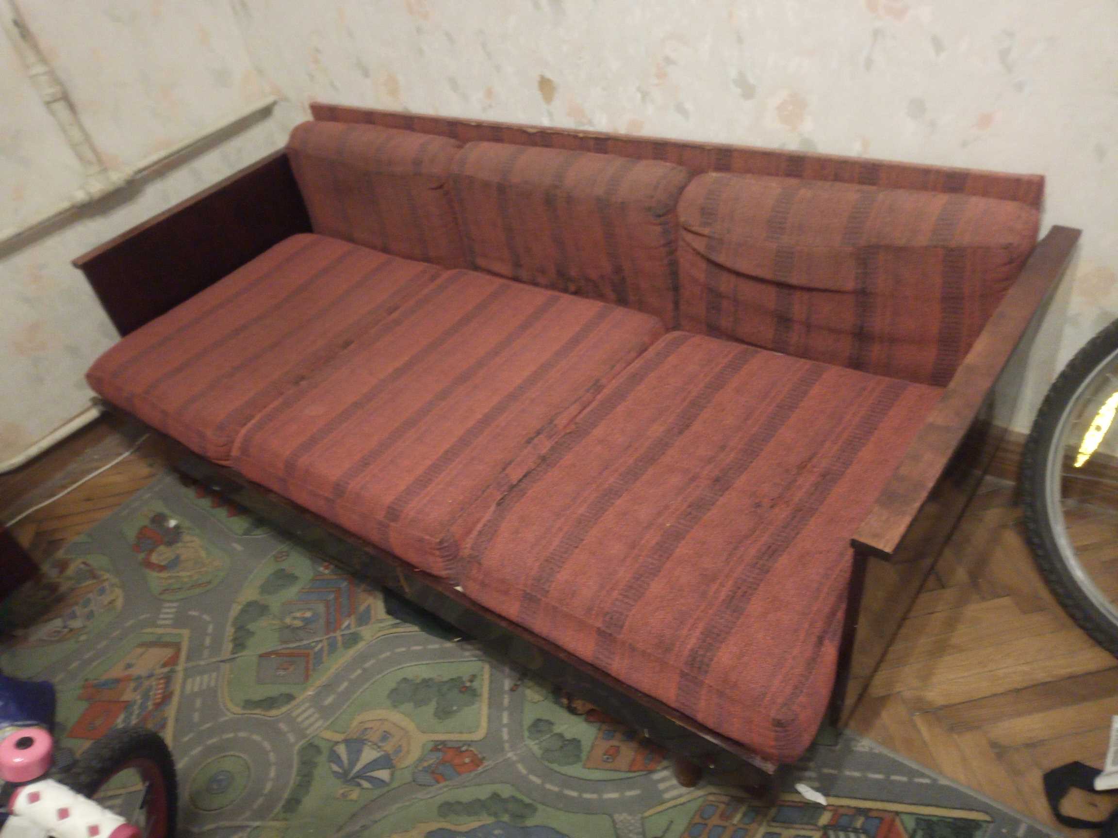 Побитый жизнью, но стойкий диванчик. Лежачее место (в нынешнем полувыдвинутом состоянии) 185х70. Если удастся выдвинуть полностью - будет 185х110. Поролон в подушках, как ни странно, не слежался и не рассыпается. Диван живёт на Комсомольской, 7 этаж, лифт. Если за пару дней не обретёт вторую жизнь на чьей-нибудь даче, во вторник отправится на свалку.