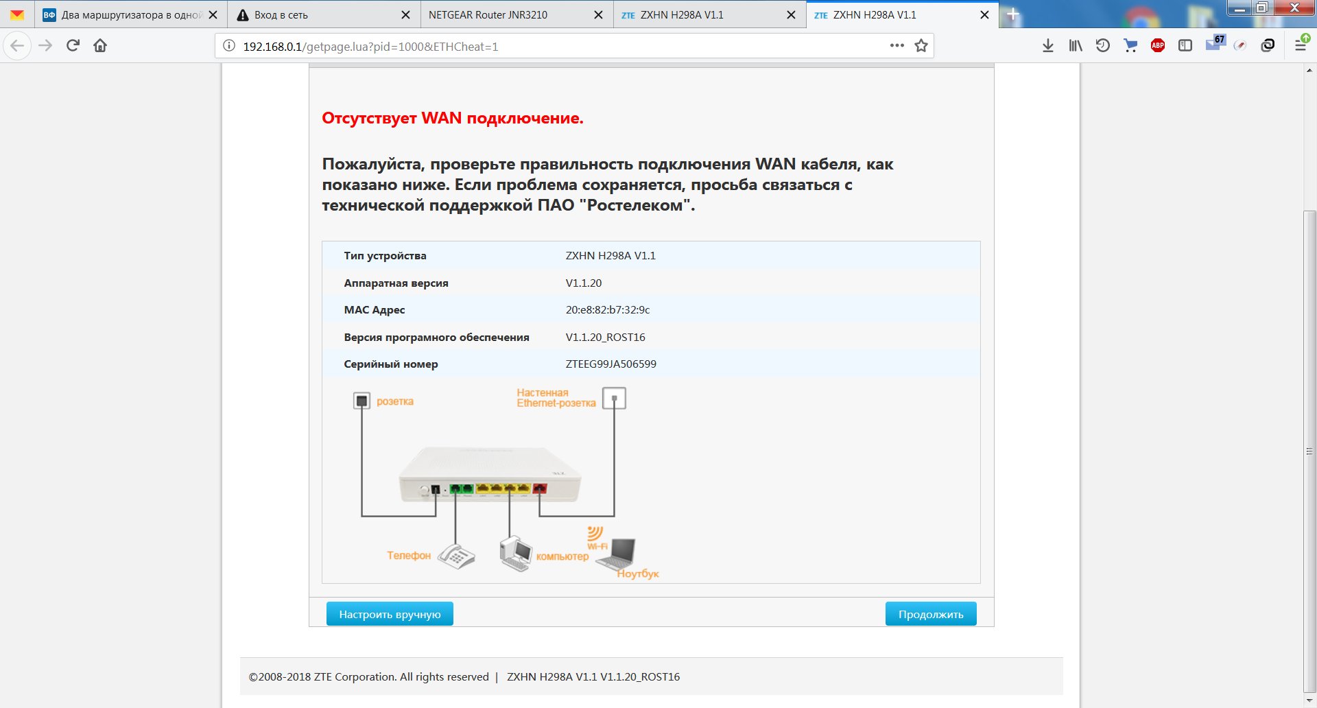 @Arturvn, ZTE проводом в wan порт. Линки все на месте, пакеты дальше ноута не идут ( В разных. ZTE раздает от 192.168.0.1, Netgear от 192.168.1.1