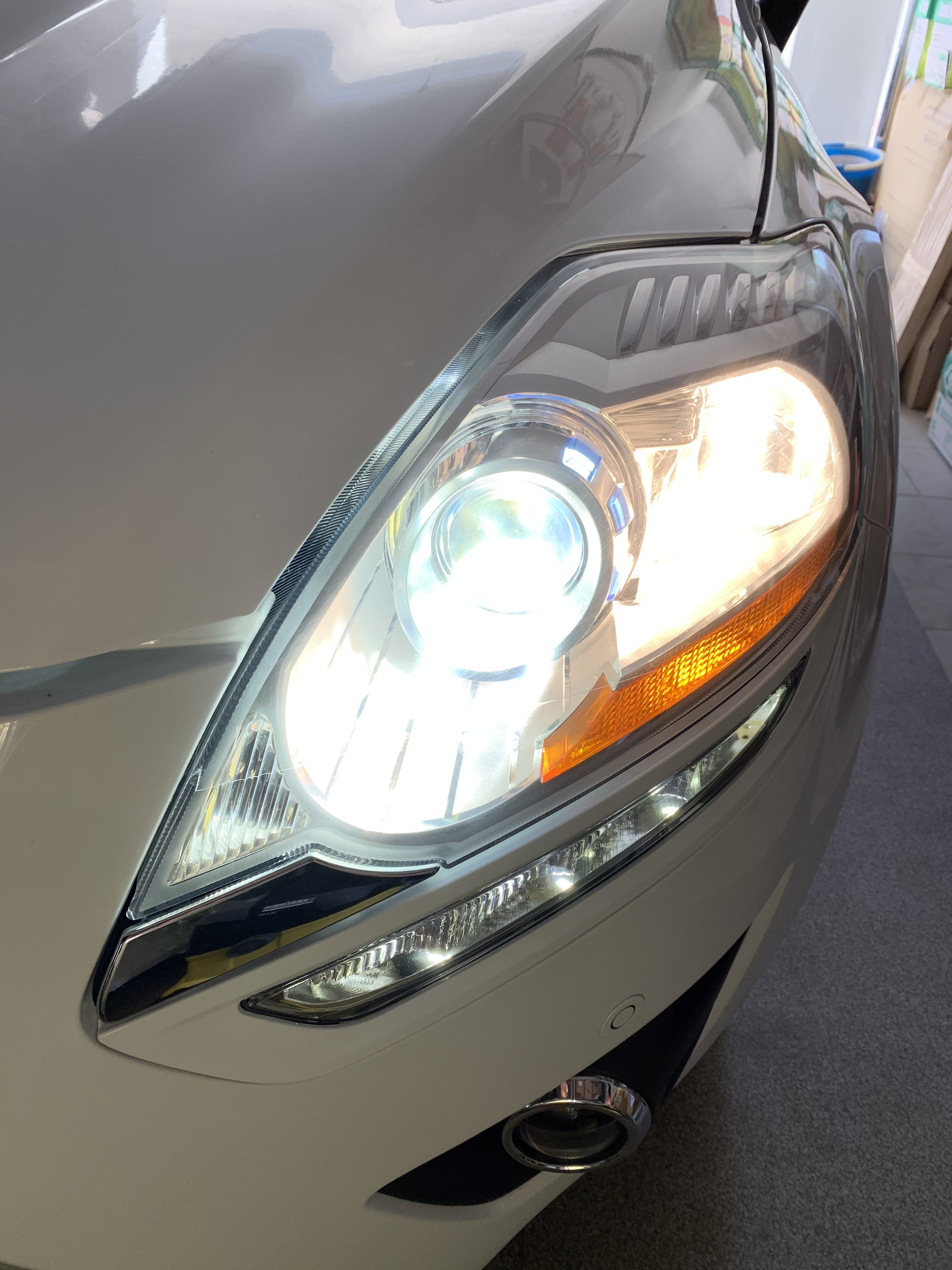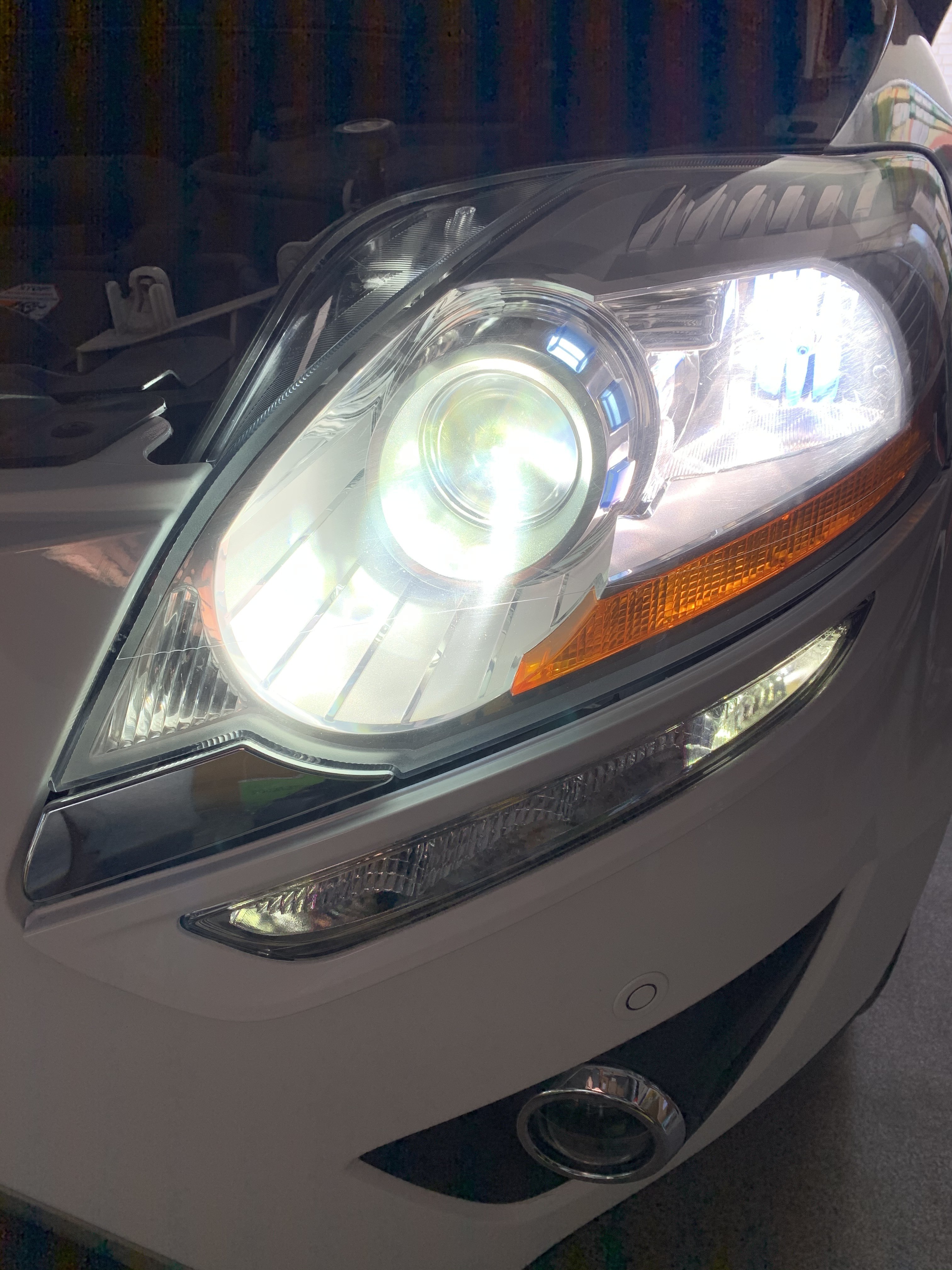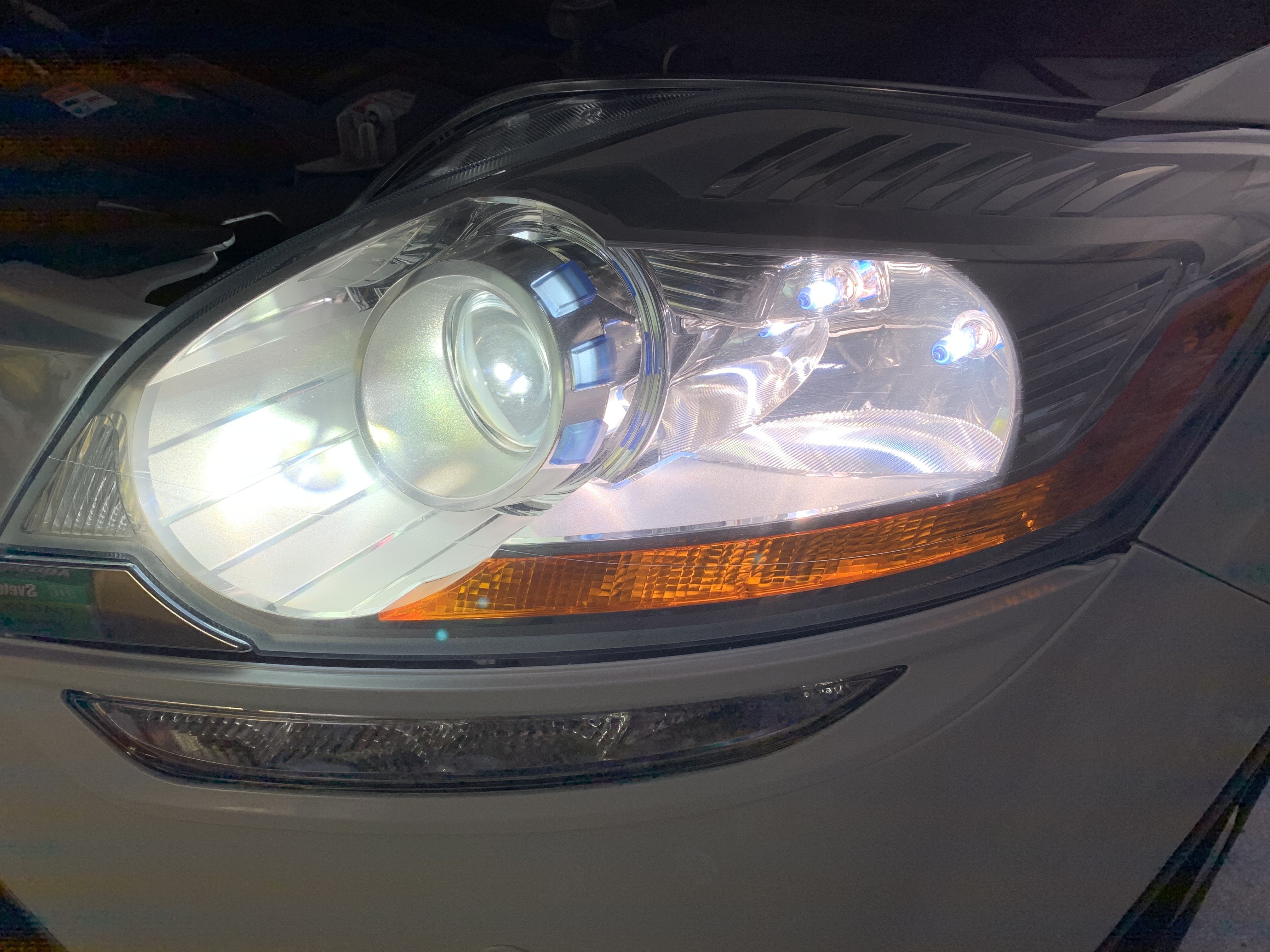 Родной ксенон сменил на 5000К так же, в дальнем стоят Philips Diamond Vision 5000K, в ПТФ они же, свет по оттенку везде теперь одинаков, а то дальний и ПТФ были желтыми совсем по сравнению с ксеноном. Сами колбы у Филипса синие, но синим не светят, белый как ксенон. Никто не моргает, да и чего моргать, на дальнем не езжу, с ПТФ тоже не езжу., фары не задраны, машина с автоматической регулировкой амортов, т.е груженая или нет, пофиг, фары светят ровно. Ну и само собой еще датчики на ксенон спереди и сзади.