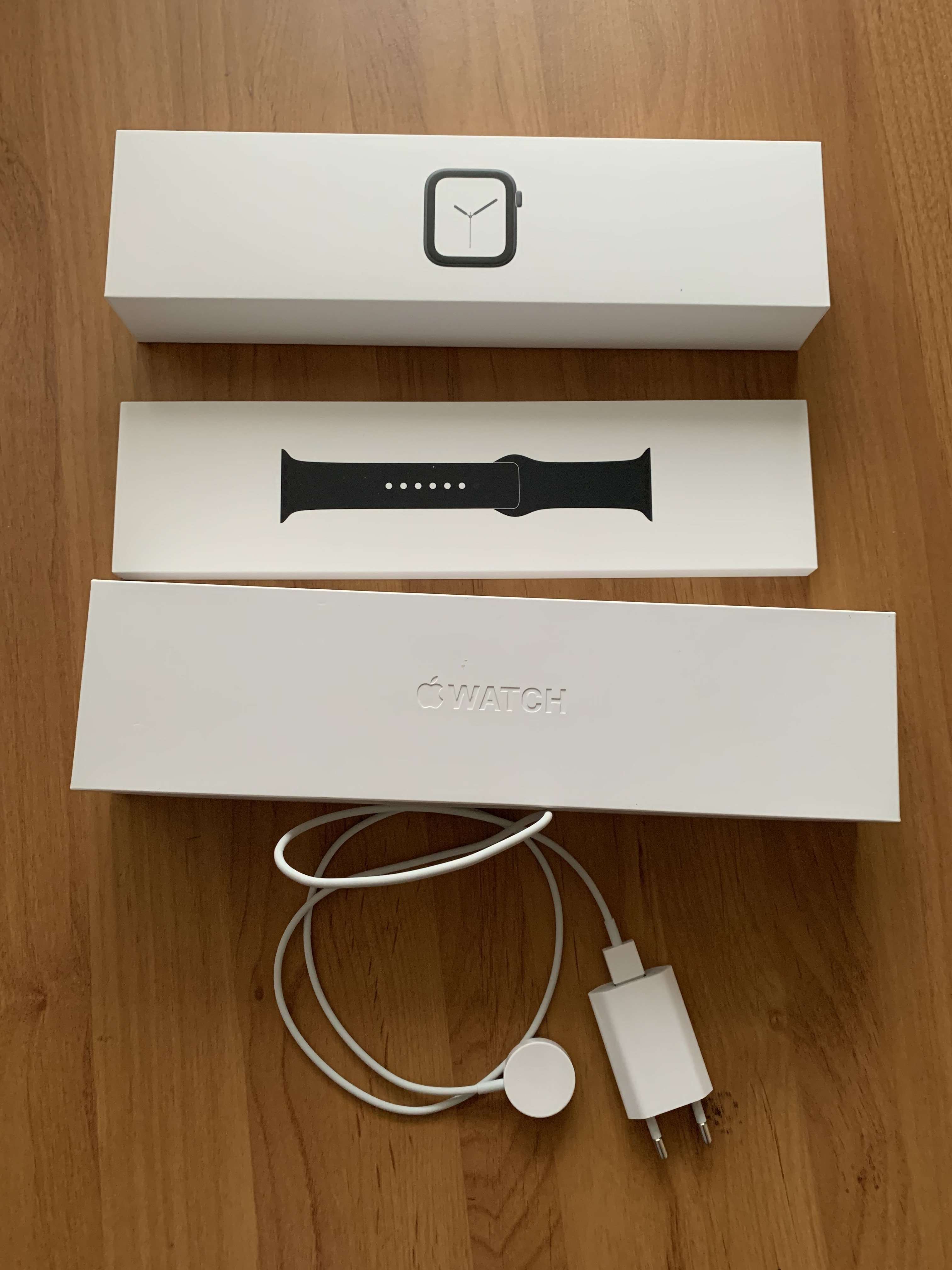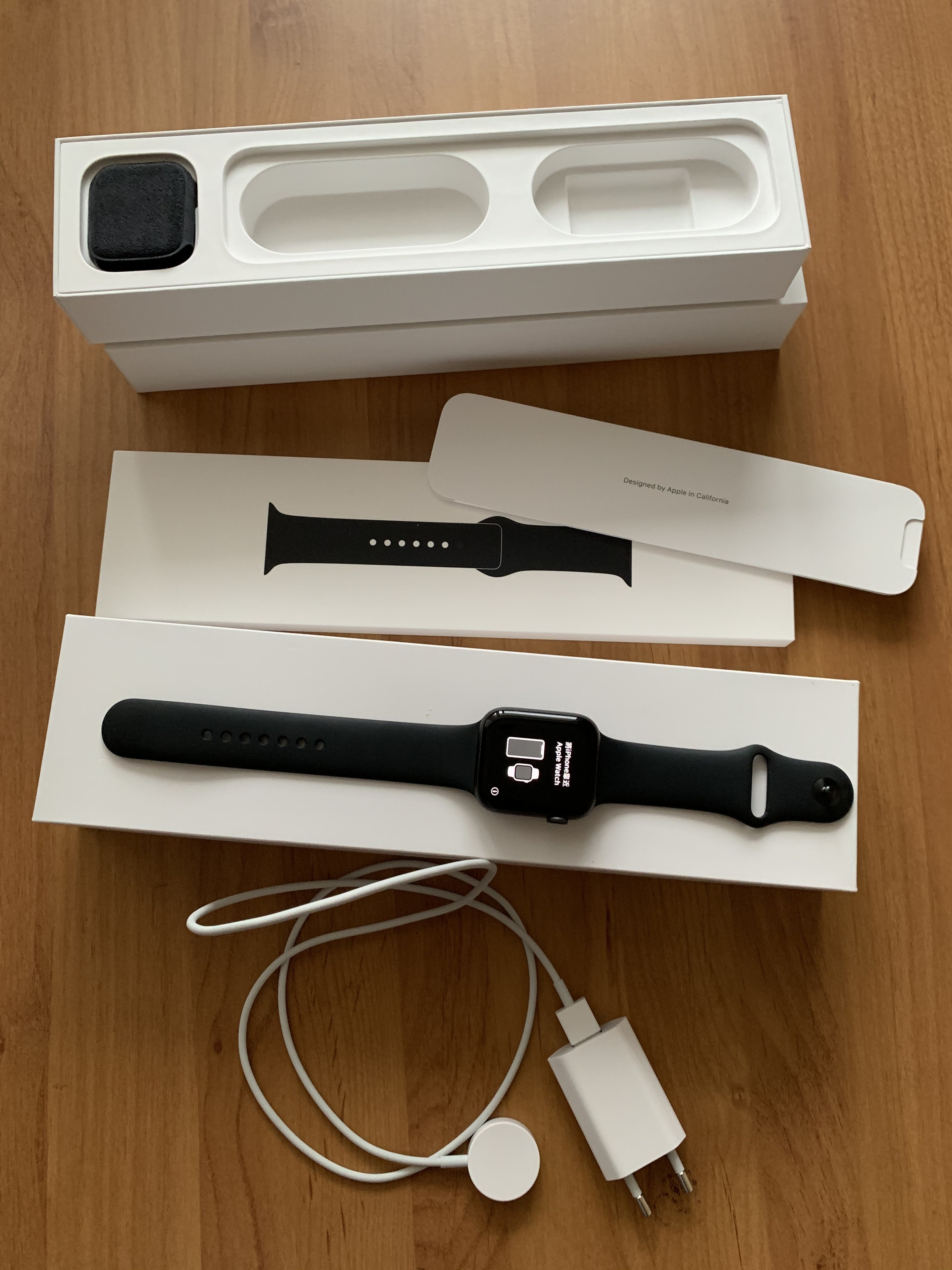 Продаю Apple Watch 4 44 мм, алюминиевые, space gray. Состояние на 4+. Есть две небольшие царапины на экране. Видно на фото. В мае делалась коммерческая замена часов. Полный комплект. Ремешок, кабель, блок питания. Часы сброшены из iCloud удалены.