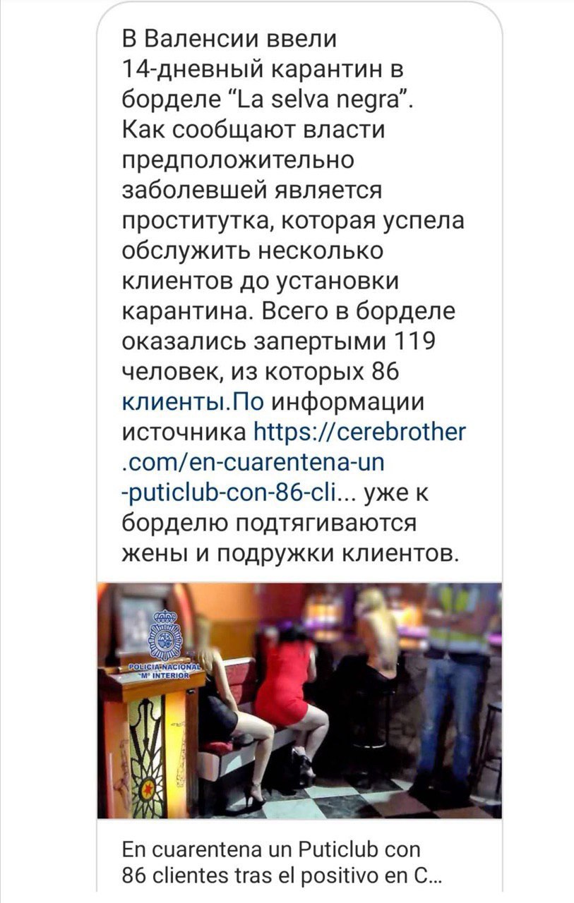 Довольно забавный фейк )) даже есть опровержение)) No, no han puesto en cuarentena 'un puticlub con 86 clientes tras el positivo en coronavirus de una prostituta': es un contenido 'satírico' que se viraliza como real - Maldita — Periodismo para que no te la cuelen
