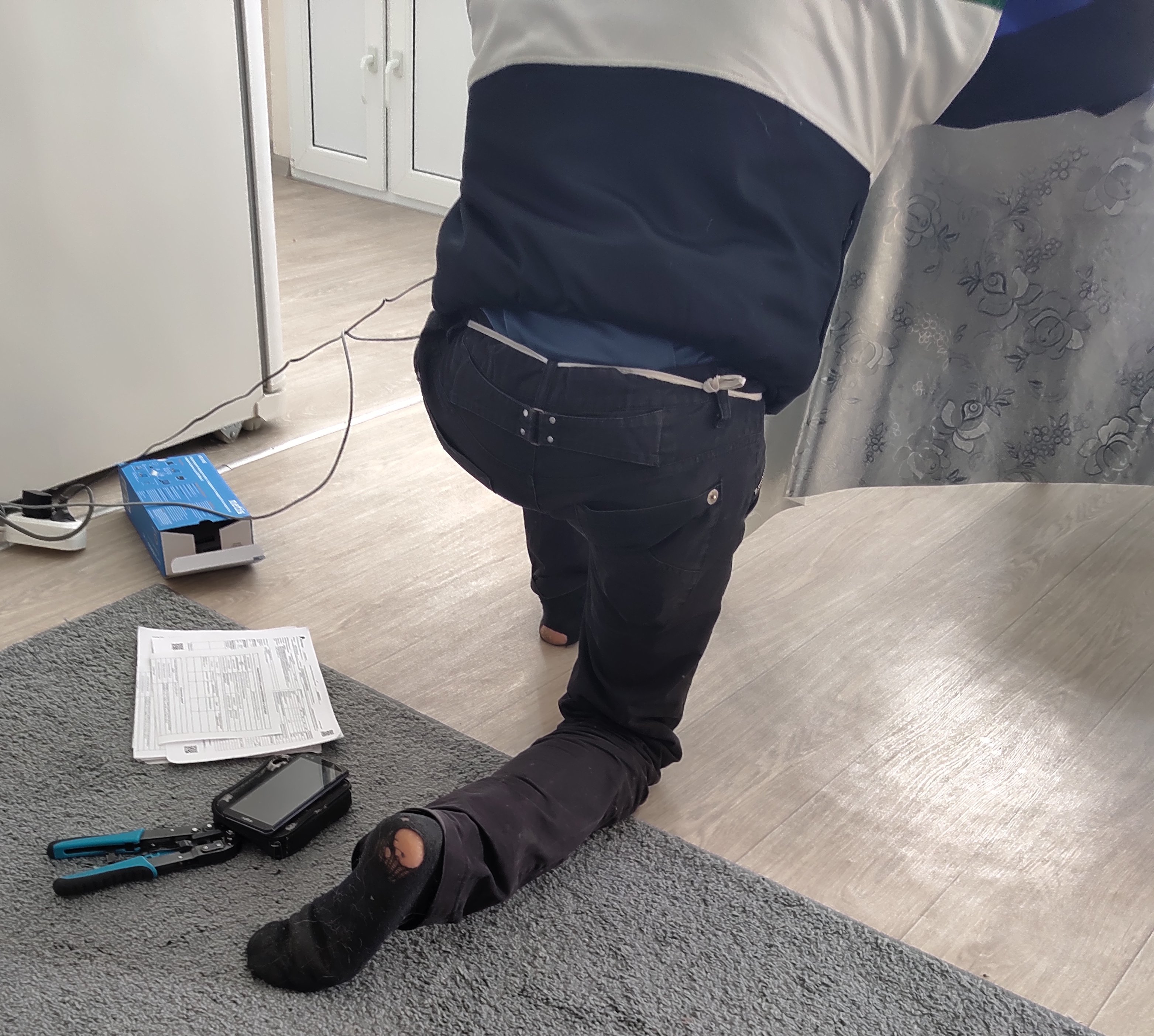Сегодня представитель среднего класса подключал мне интернет в Новокуе: На двух носках дыра, что все пятки вылезли, вместо ремня резинка от трусов, запах от него умопомрачительный, пришлось комнату проветривать.